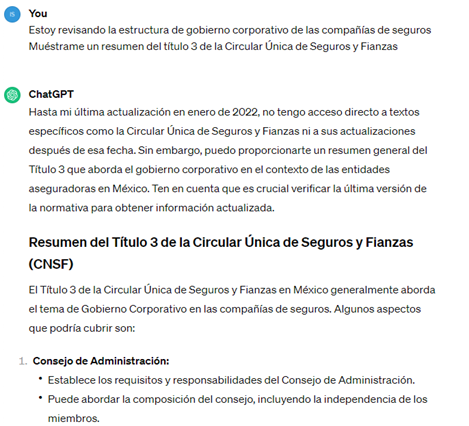 Como último avance, intenté que ChatGPT me resumiera secciones de una legislación, lo cual se logró con éxito, creo que será una herramienta muy útil para sintetizar leyes: