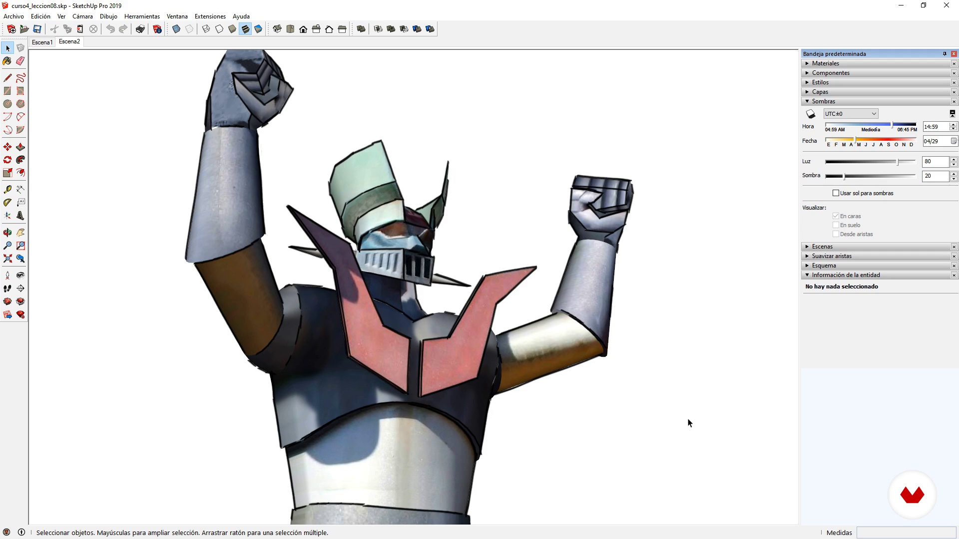 “Nesta lição veremos o que são os estilos gráficos do SketchUp e quais valores regulam. como por exemplo o tipo de linha ou o tipo de fundo. Vamos conferir. Para isso. utilizarei este modelo que possui duas cenas distintas. Vou. por exemplo. para a segunda cena. É essa a perspectiva. Em resumo. o estilo gráfico define a espessura e o tipo das linhas. o fundo. as que utilizamos. entre outros. Para isso. necessito da janela de estilos. Ela é essencial para ajustar esses Caso a janela não esteja acessível. posso ir em Janela. bandeja padrão e aplicar estilos como nas outras janelas. garantindo ...”