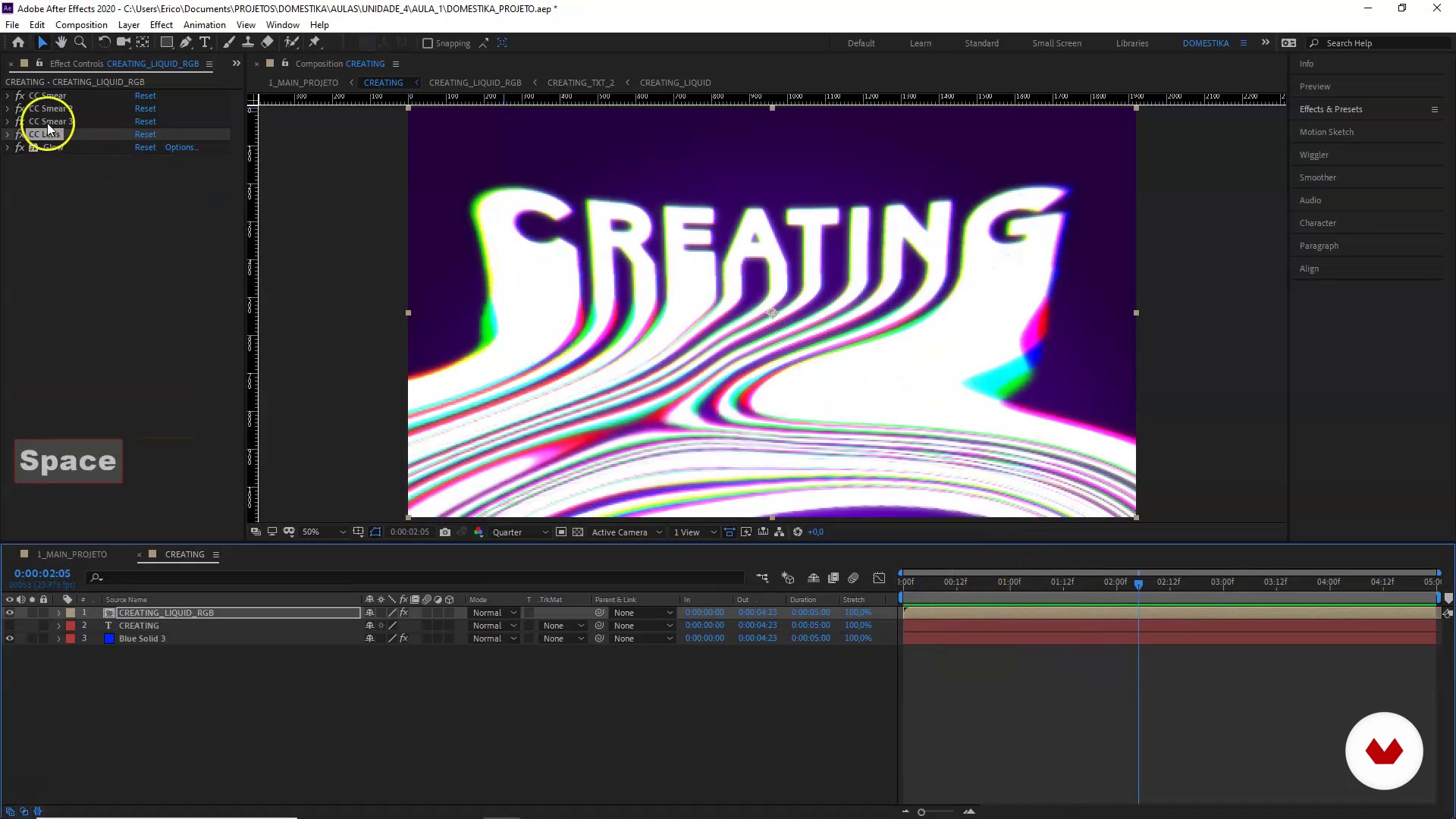 “Nesta aula, vamos começar com a finalização do nosso projeto. A gente vai juntar as palavras que formam a nossa pálida e adicionar alguns efeitos. Vamos lá? Então eu criei aqui uma composição principal chamada main-projecto principal eu sei que essa é a composição principal, então eu deixo ela fora de tudo e ela também depois me ajuda a guiar, se eu tiver muitas composições, a partir dela que eu vou ter todas as outras. Aí eu venho aqui, ó. Abram a nossa pasta onde a gente tem as outras composições e venho trazendo as composições para dentro. Dessa composição principal. Joguei aqui Lembrand...”