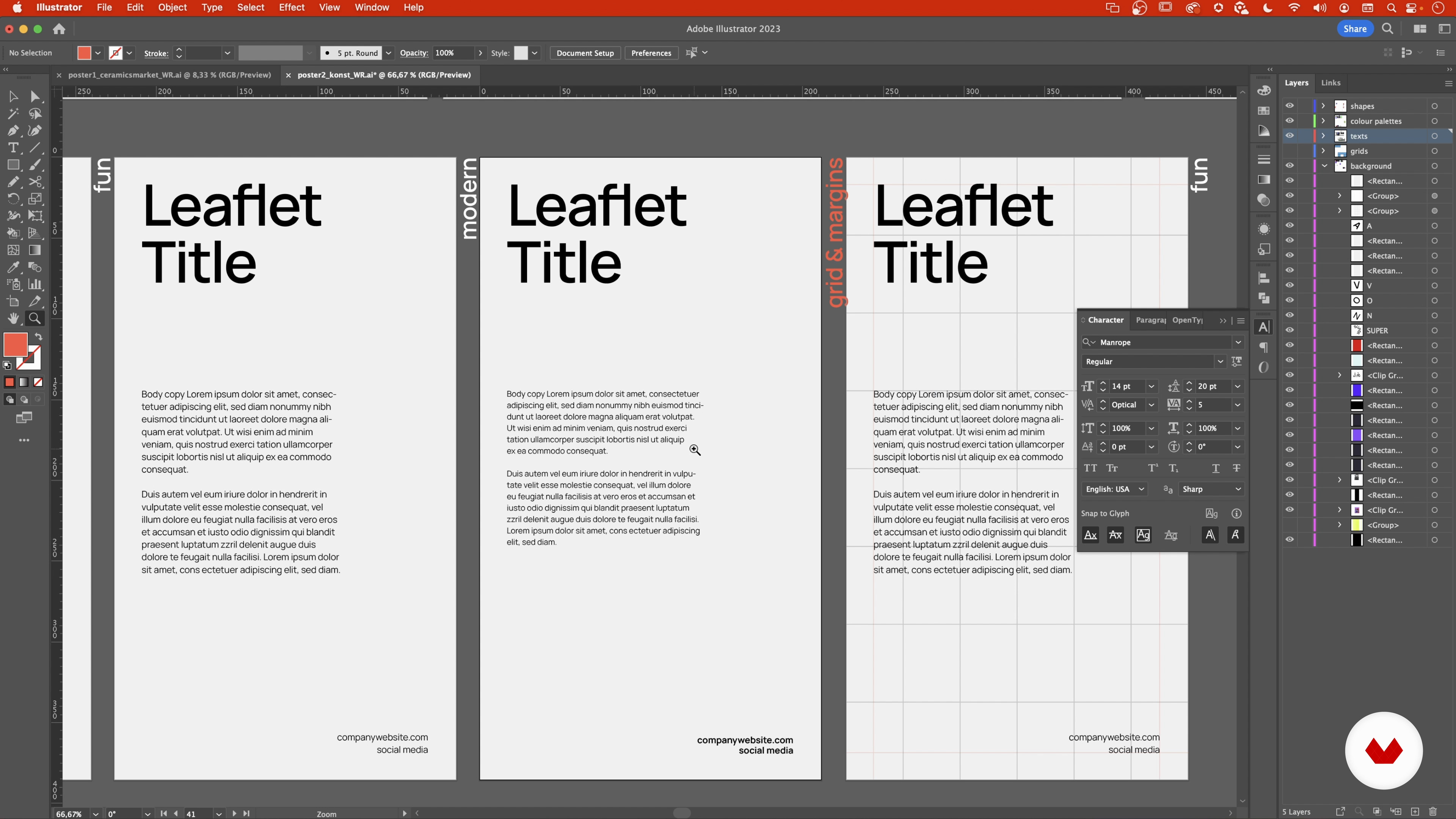 “Agora irei trabalhar com tipografia no Adobe Illustrator. Você aprenderá como escolher a fonte certa para 3 cenários imaginários. Usarei um design de folheto simples para testar minhas ideias tipográficas. ”
