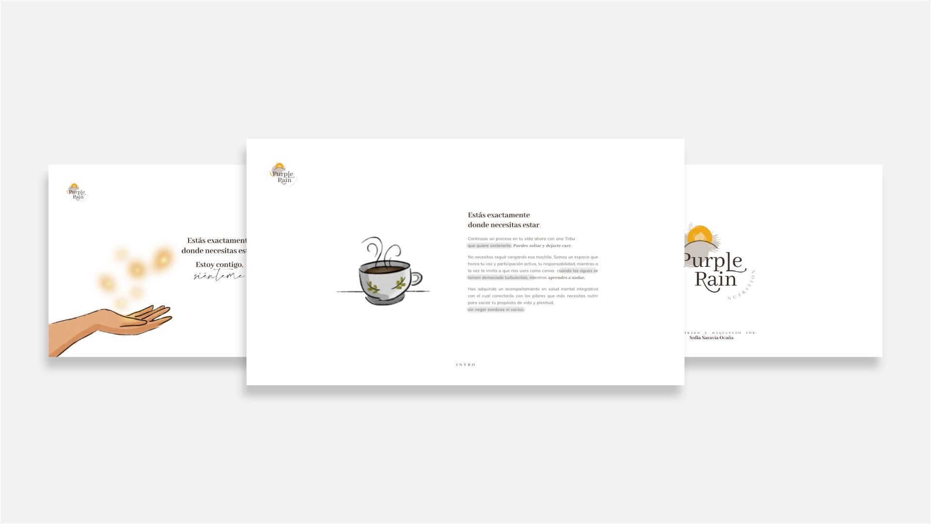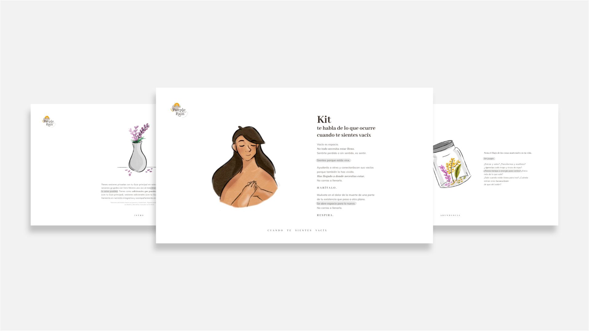 Desarrollo completo de diseño e ilustración editorial para Kit, quien da la bienvenida a formar parte del acompañamiento con el equipo Purple Rain Nutrition. Este incluye tanto texto, como ilustraciones y audios para transitar oscuridad y momentos difíciles en la cotidianidad, al mismo tiempo que recomienda libros y documentales que buscan abrir la mente y conectar el espíritu con minimalismo y vulnerabilidad.