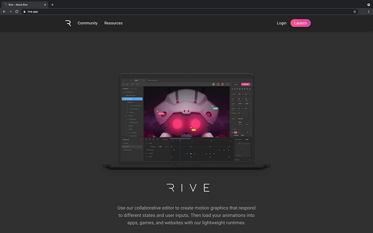 Rive https://rive.app/ es una herramienta que te permite crear contenido interactivo y usarlo en diferentes plataformas. Aunque aún esta en beta, se pueden crear animaciones muy interesantes con la herramienta. Estas son algunas de las animaciones que he realizado para el sitio.