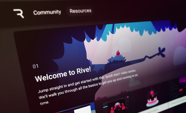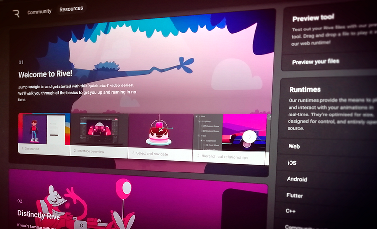La página de recursos es donde puedes encontrar toda la información que necesitas saber sobre Rive. Desde allí puedes acceder al Centro de Ayuda, al Canal de YouTube, a las Runtimes, etc. Esta página está dividida en tres partes. Welcome to Rive, Distinctly Rive and Runtime Funtime.