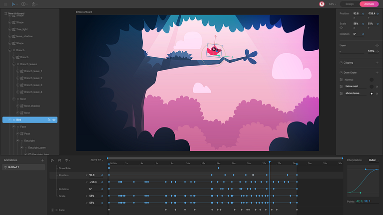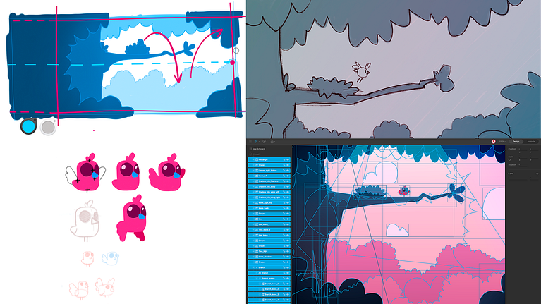 Welcome to Rive! El mejor lugar para aprender algunas cosas básicas sobre Rive. Para esta sección y relacionándola con el aprendizaje, la idea era mostrar el momento en que un pájaro aprende a volar.
