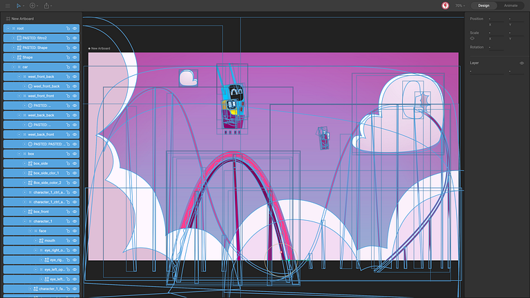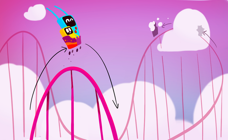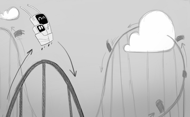 Runtime Funtime. La parte divertida. Implementar e interactuar con las animaciones en la web, la aplicación o el juego. Para esta parte, la idea era mostrar un momento de diversión con un par de dispositivos en una montaña rusa.