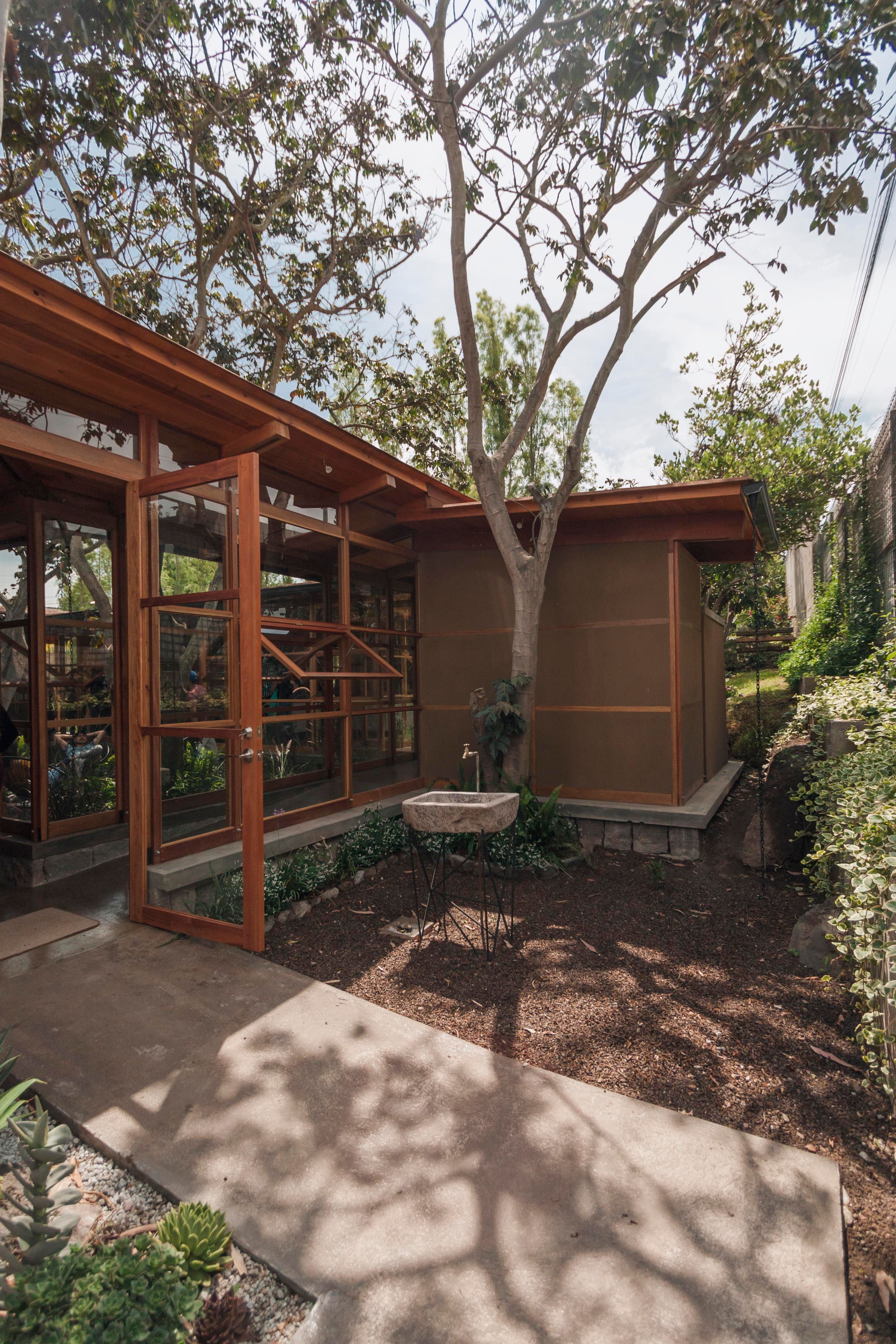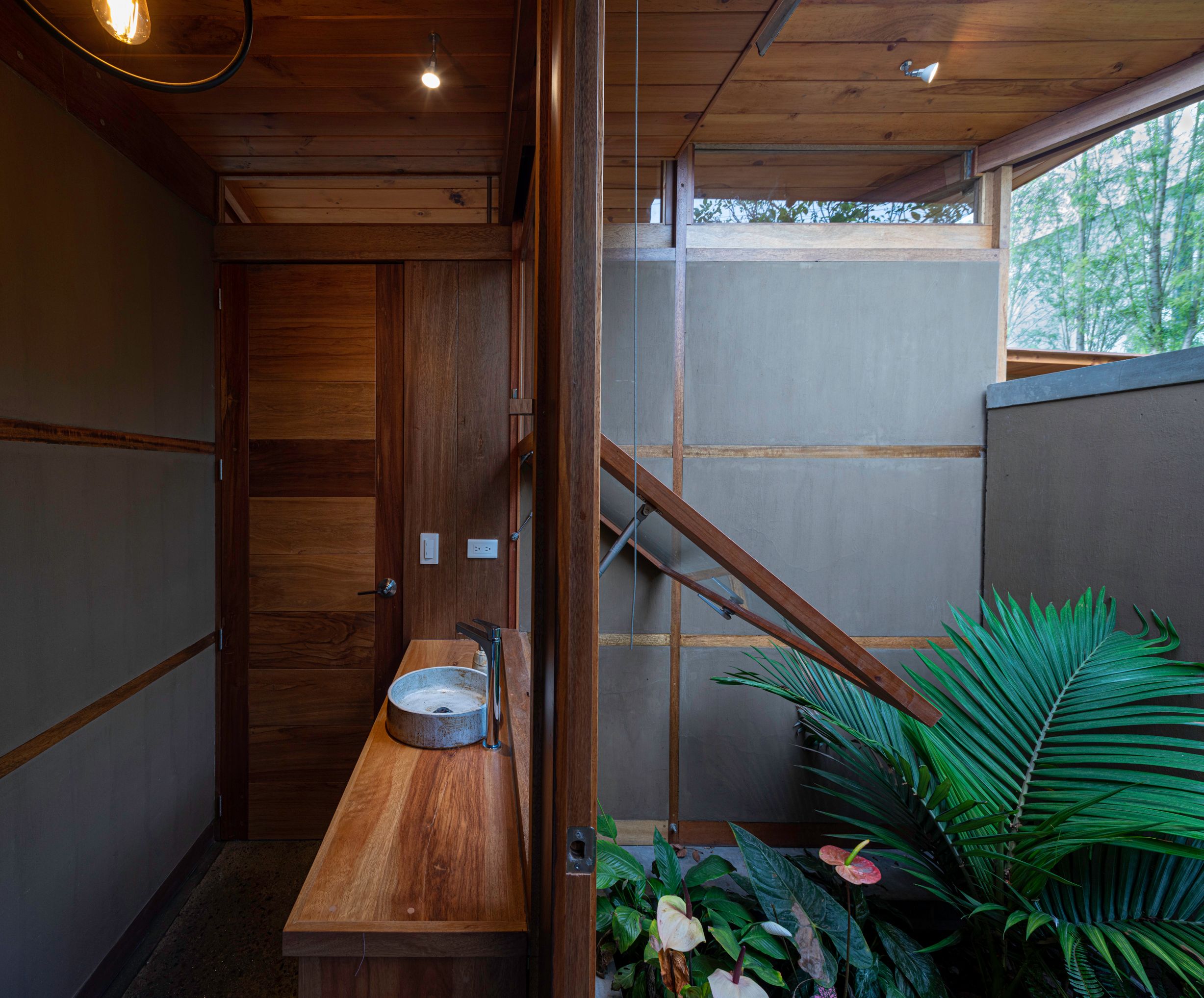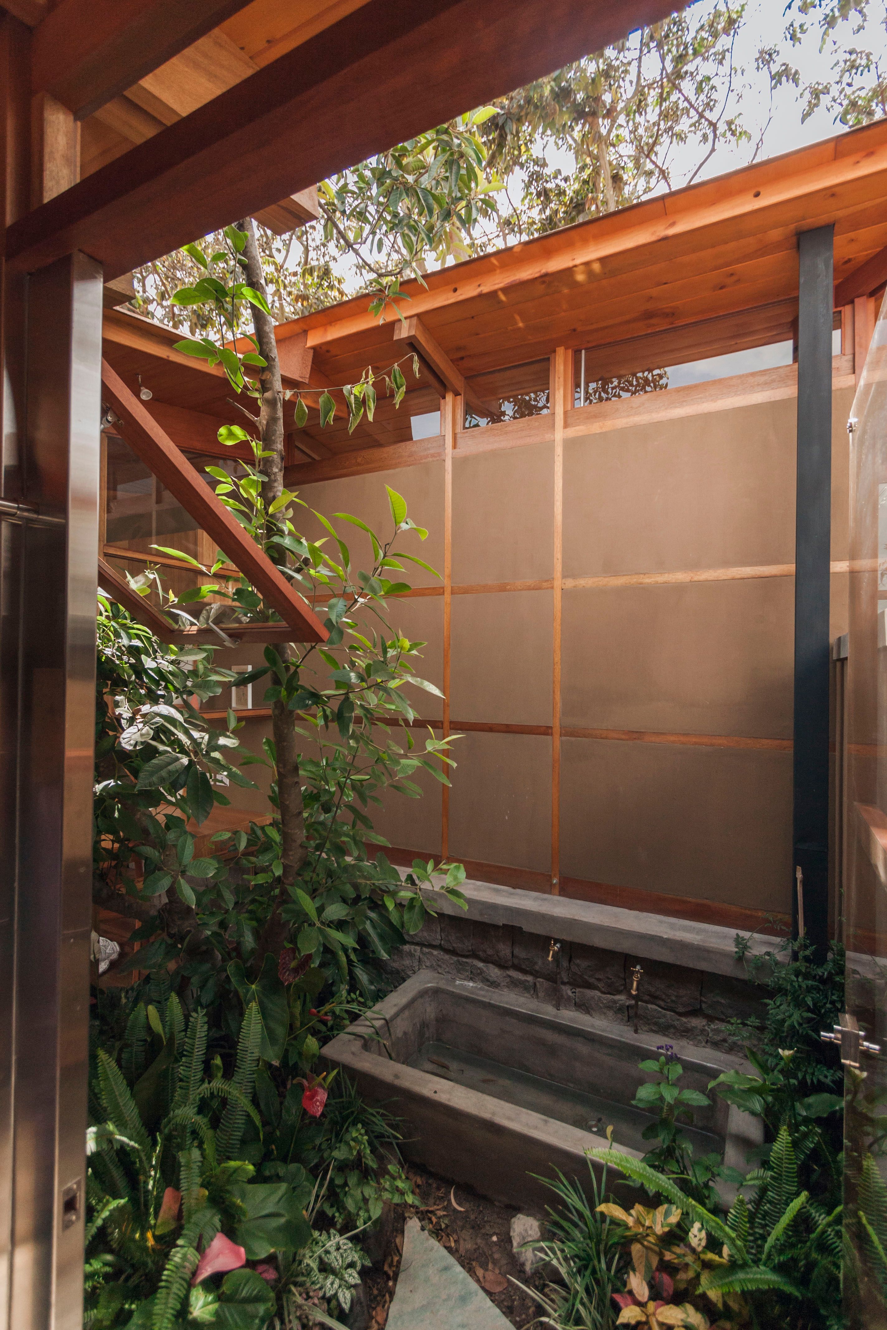 Em espaços que exigem privacidade, como quartos e banheiros, o projeto é introvertido. Seus pátios são delimitados por fachadas estruturais de pau a pique e por muros que, separados dos espaços de convivência, garantem privacidade e uma conexão direta com a natureza.