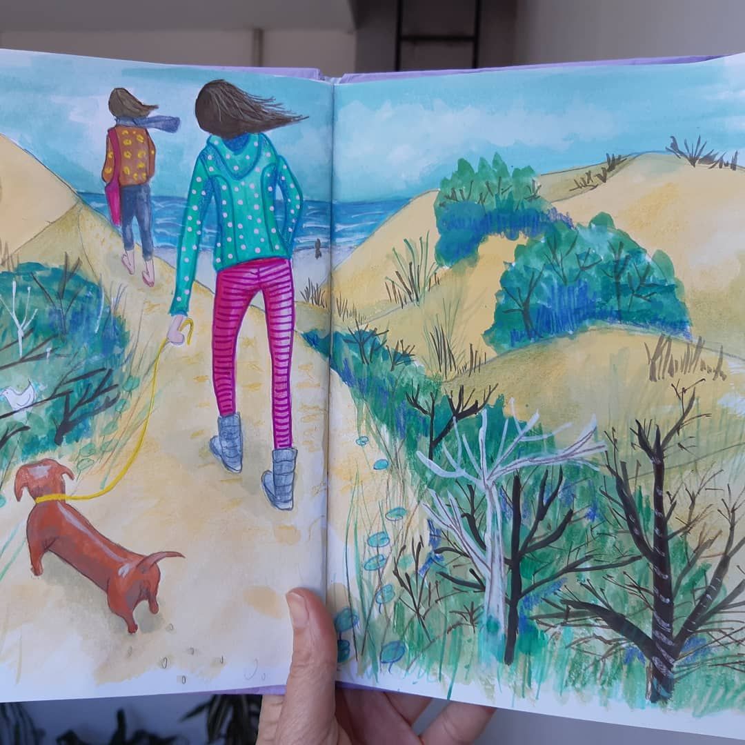 Belo desenho! Eu amo as texturas nas plantas. Teria sido bom deixar o roxo / vermelho voltar mais uma vez, em algumas flores por exemplo? ou a coleira do cão (muito fofo)?