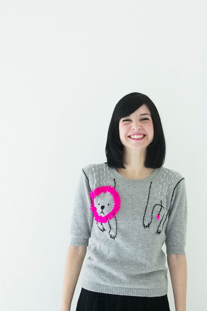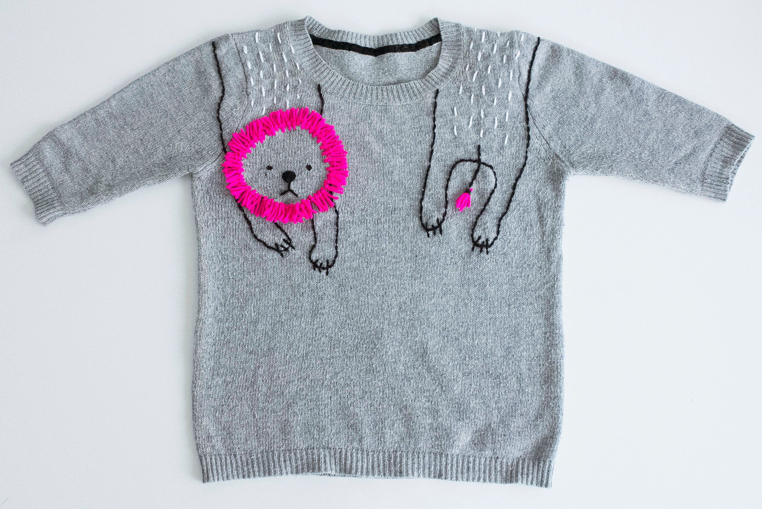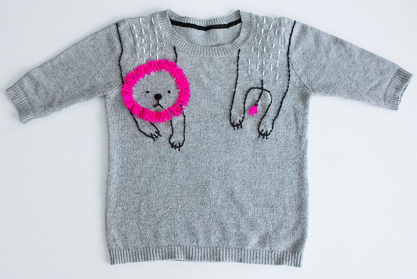 For two years I've collaborated with a new, fresh craft italian magazine which sadly isn't published anymore, called Peggy Journal, for whom I created some refashion project. This was on an old, fitted grey sweater. I've started roughly sketching the lion's shape on the shoulders, with a fabric chalk. Then I've embroidered the outline by backstitch with some black yarn leftover and a wool needle. At the end I've added some fringes made with neon pink wool yarn to resemble the lion's mane.