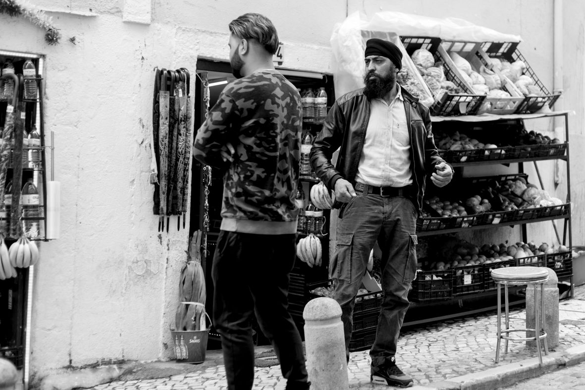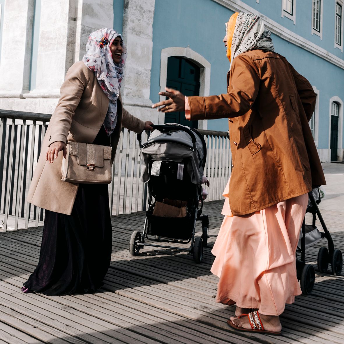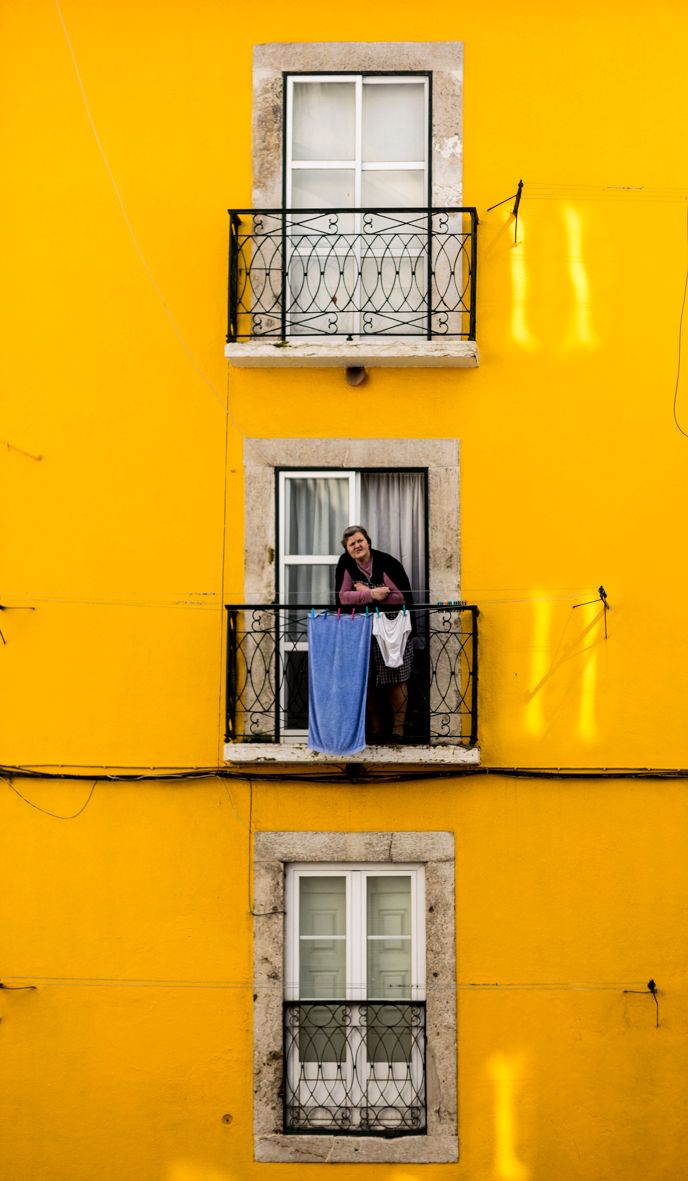Uau Fabiana! Acho lindo seu trabalho. Elogios! Algumas fotos são realmente poderosas, muito poéticas, tocam a alma. Quase parece que as pessoas estão falando com seus arredores. O homem de chapéu vermelho e cigarro na boca parece estar falando com as pedras e lhes confidenciando seu estado de espírito. Na foto seguinte gosto muito da menina do graffiti com os cabelos ao vento e a mão do homem que parece acariciar a esfera. Há muita harmonia cromática e um certo movimento que despertam em mim algo mágico. Linda também é a imagem das duas mulheres de véu que estão na rua, cada uma com seu carrinho. As cores das duas mulheres (o rosa da saia esvoaçante da mulher da direita, o casaco marrom, a borda amarela do cachecol, o cinza e o preto da mulher da esquerda) harmonizam-se perfeitamente com o fundo azul da prédio. E o seu olhar, o seu sorriso, o gesto arrebatador dos seus braços falam-me da alegria e da surpresa do seu encontro. É como se estivessem num mundo à parte, isolados de tudo, numa espécie de bolha suspensa no ar e fora do tempo. Poesia pura. Da mesma forma a imagem do homem com os pombos, que dispensa palavras, fala por si e que tem na sua simplicidade a força da sua beleza. Também acho igualmente bela a fotografia a preto e branco da rapariga no eléctrico com o olhar perdido na cidade e fechada entre os dois homens vistos de costas, cada um enquadrado na sua própria vidraça, e a fotografia a cores da senhora a olhar para fora na varanda, também emoldurada em baixo e em cima pelos terraços, com o amarelo ocre do edifício, tão quente e envolvente, que te abraça e prende o olhar, trazendo-te para a mulher, o azul dos lençóis, o branco dos a cueca e a marca da camiseta que ela está vestindo. É uma imagem que talvez pelas suas cores, pelas suas simetrias e por um certo algo, me fascina.