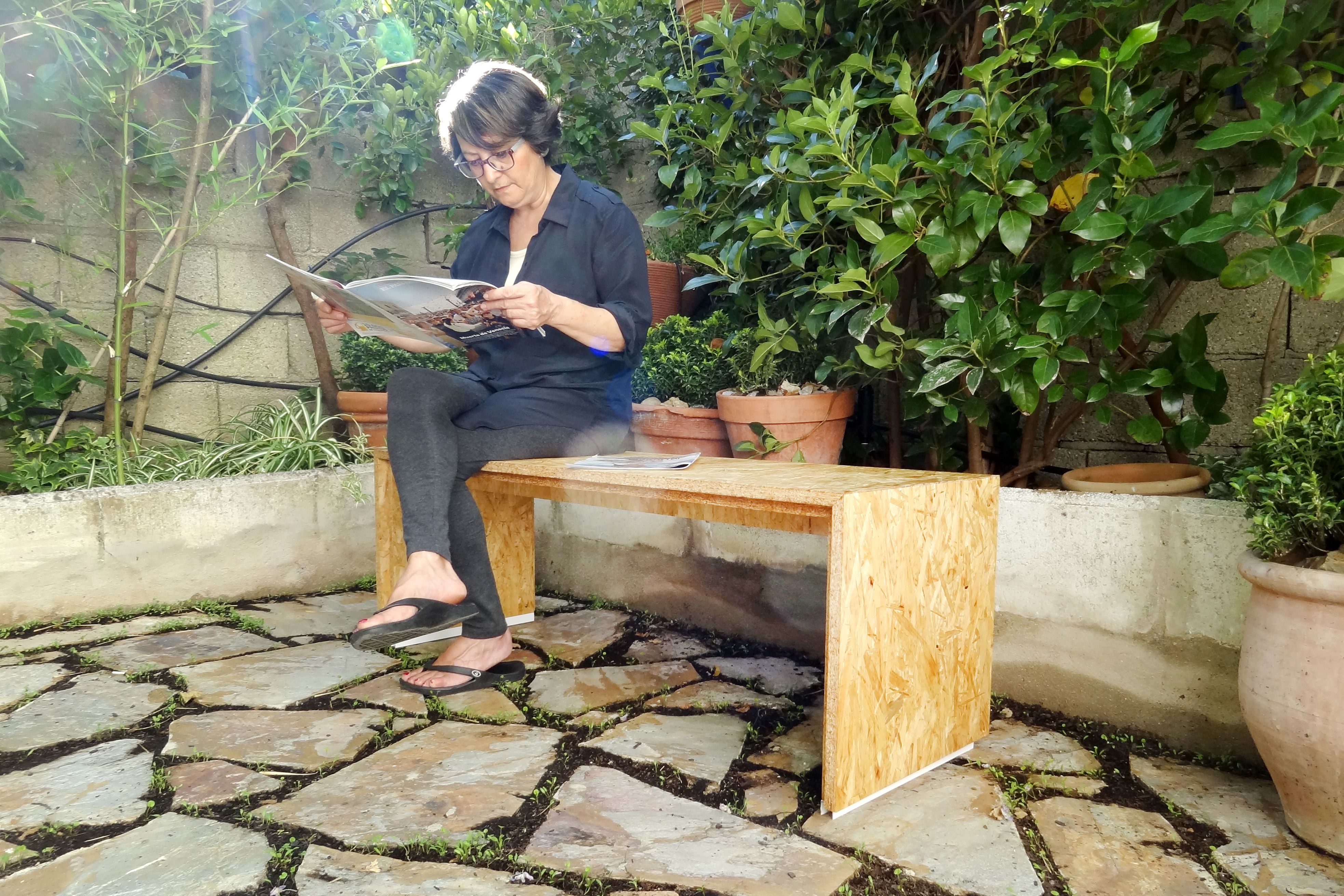 Esta pieza también pretende ser una experiencia sobre las capacidades de impermeabilización de los aceites y las ceras naturales aplicados a productos de madera. La estructura del osb no ofrece buenos comportamientos en ambiente humedos y de exterior. El agua y la humedad producen la hinchazón, la deformación y la perdida drástica de durabilidad de este material. Los bordes de este material son los puntos más debiles, por donde el agua y la humedad tendran facilidad para entrar. En este caso se ha aplicado varias capas de aceite de linaza sobre toda la superficie y los bordes. El aceite, por su naturaleza no es capaz de tapar los poros y oquedades entre virutas, por lo que se ha recurrido a la aplicación de varias capas de cera natural, especialmente en los bordes. La naturaleza viscosa de la cera cumple la saturación de los poros y en estos momentos está dandose el proceso de testeo y control de este acabado.