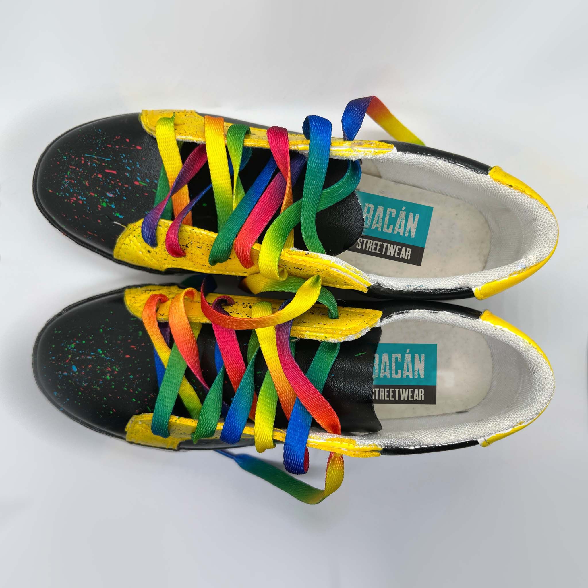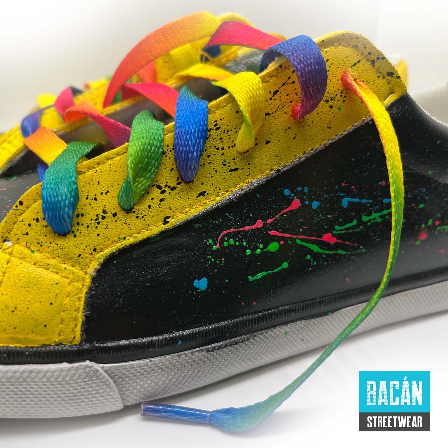Estos sneakers fueron ideados con la inspiración de las camisetas de los pintores con todas sus salpicaduras. Partí de una zapatilla totalmente blanca para pintarla con una base de negro y amarillo y luego realizar las salpicaduras y añadir las etiquetas en los interiores y los cordones arcoiris.