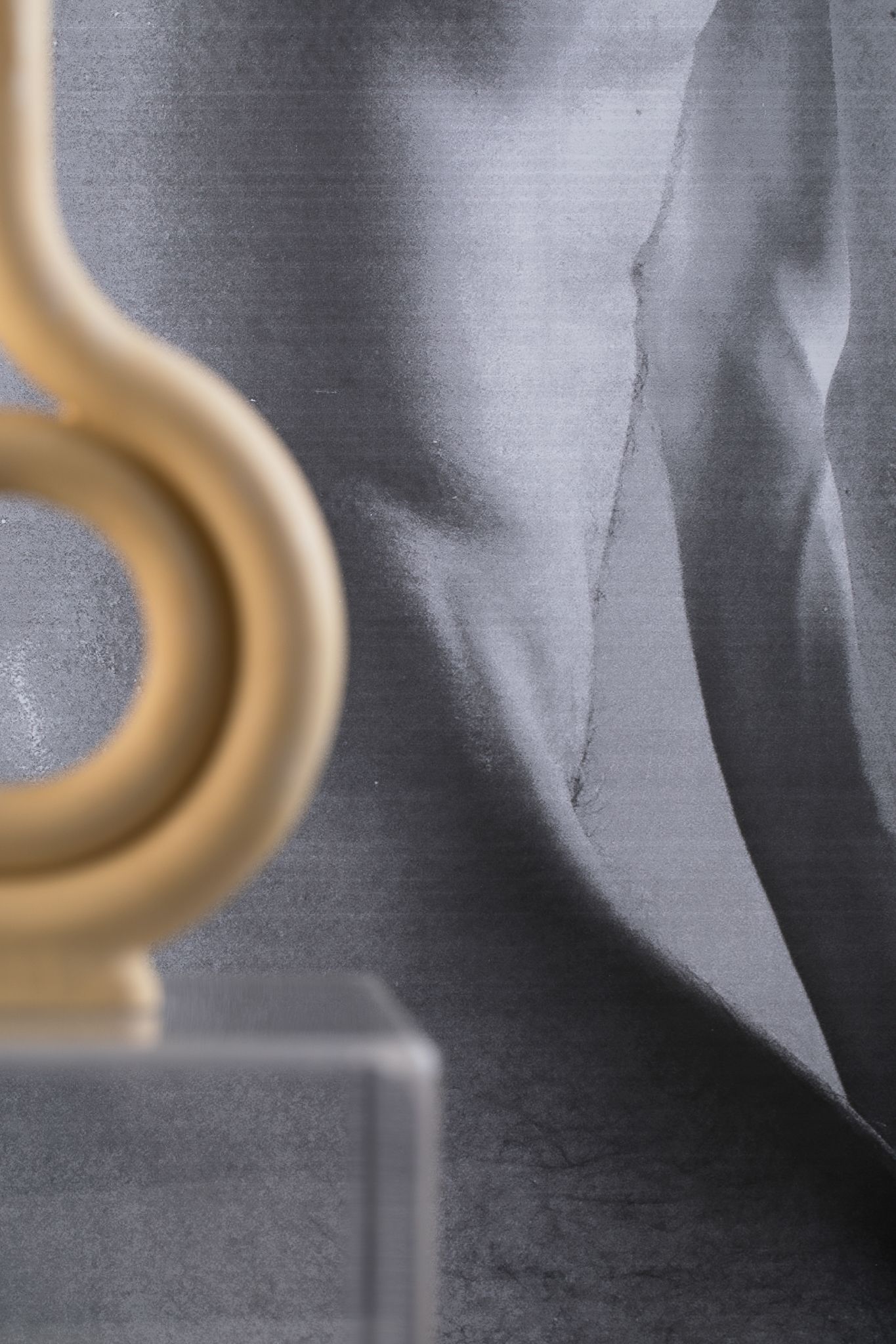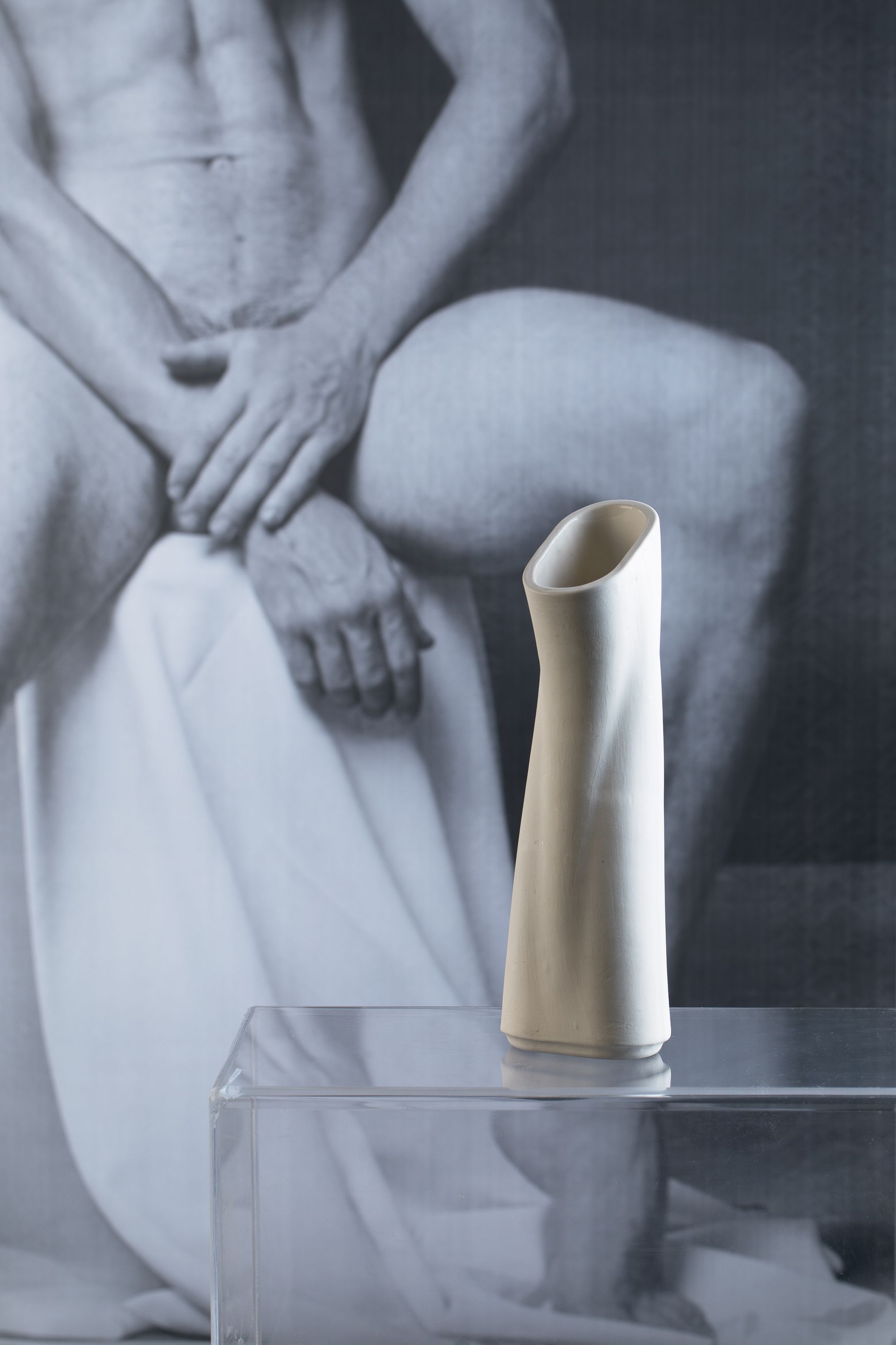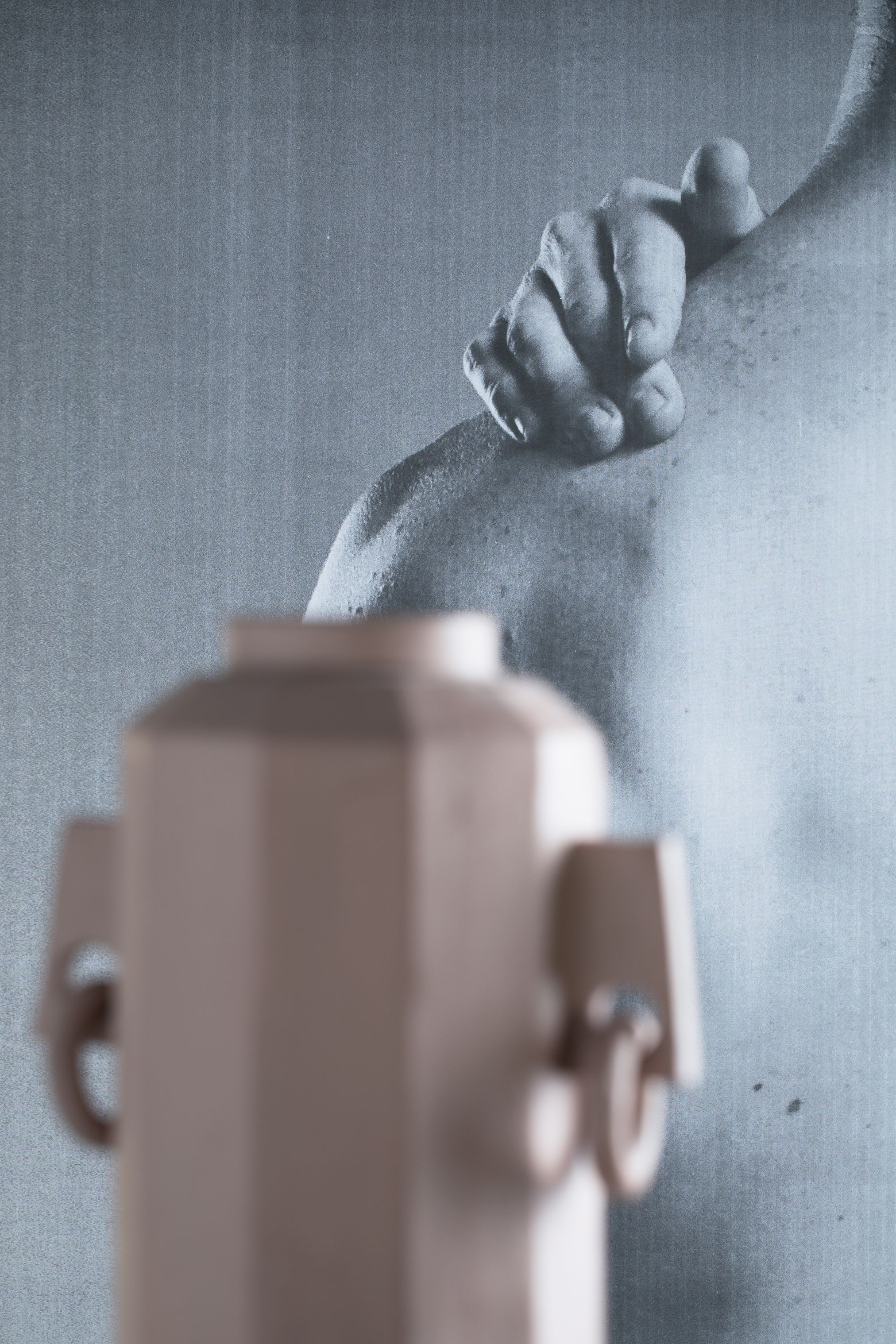 The collage was created by a xerox print of a 35 mm black and white roll of film photographed and created by Malkiella Benchabat especially for the project at hand. The final result; aka the collage between ceramic object and print, was photographed using a digital camera. An interesting and multifaceted dialogue concerning shape and composition emerged between Avi Ben Shoshan (designer) and Malkiella Benchabat (photographer), thus accumulating in an intriguing relationship between the crafts in each one of the images. The relationship between the body and the object is questioned as the division between who is body and who is object- becomes unclear, and especially due to the attention given to the composition of the image which harmonizes between the amorphous ceramic figure to illustrate body parts. The selected images refer to moments in the history of photography and art and question the joining of different disciplines and crafts into one cohesive work.