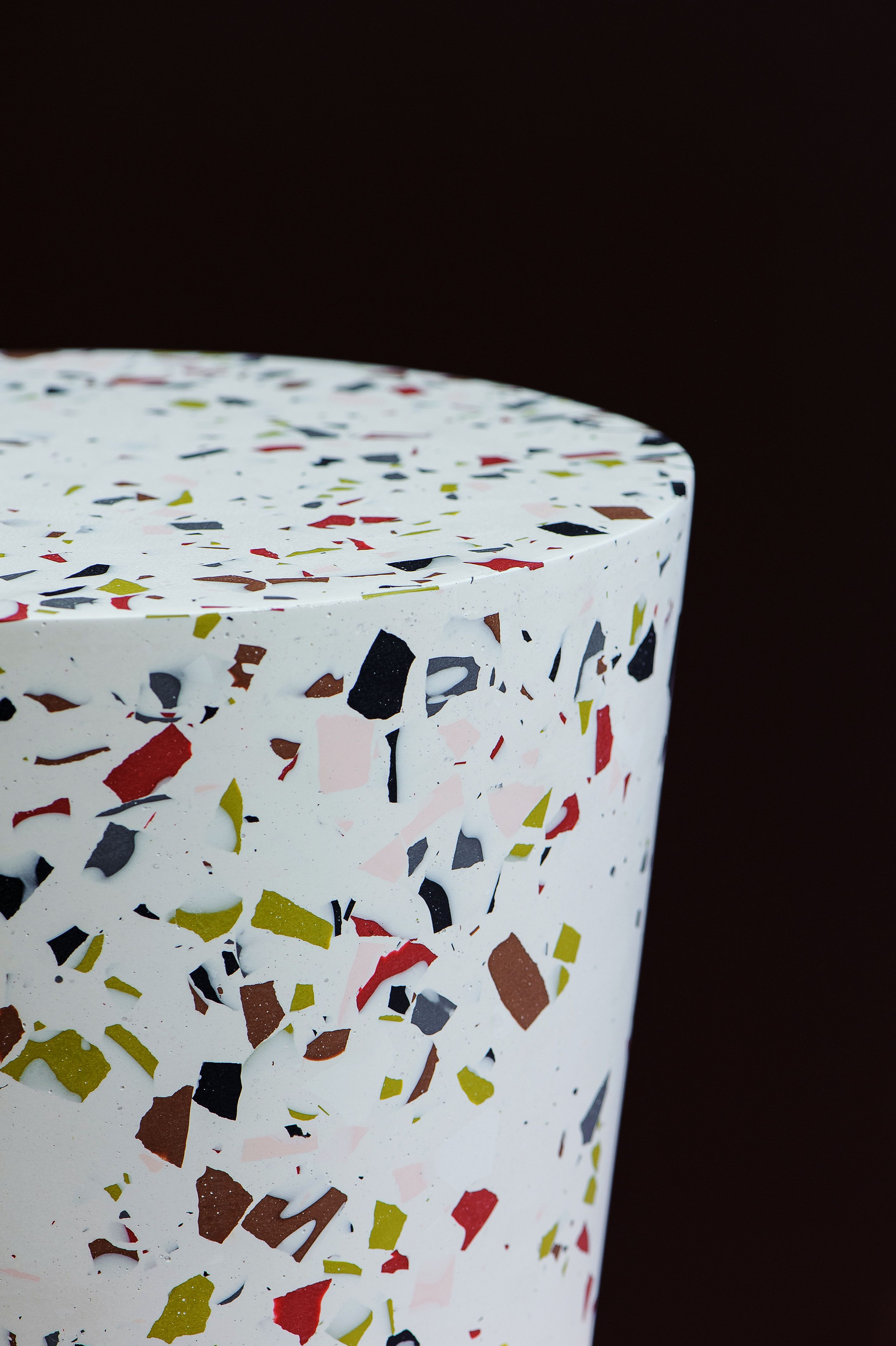A terrazzo pillar sides table. This table has a slightly tapered design and has been made with medium terrazzo chips.