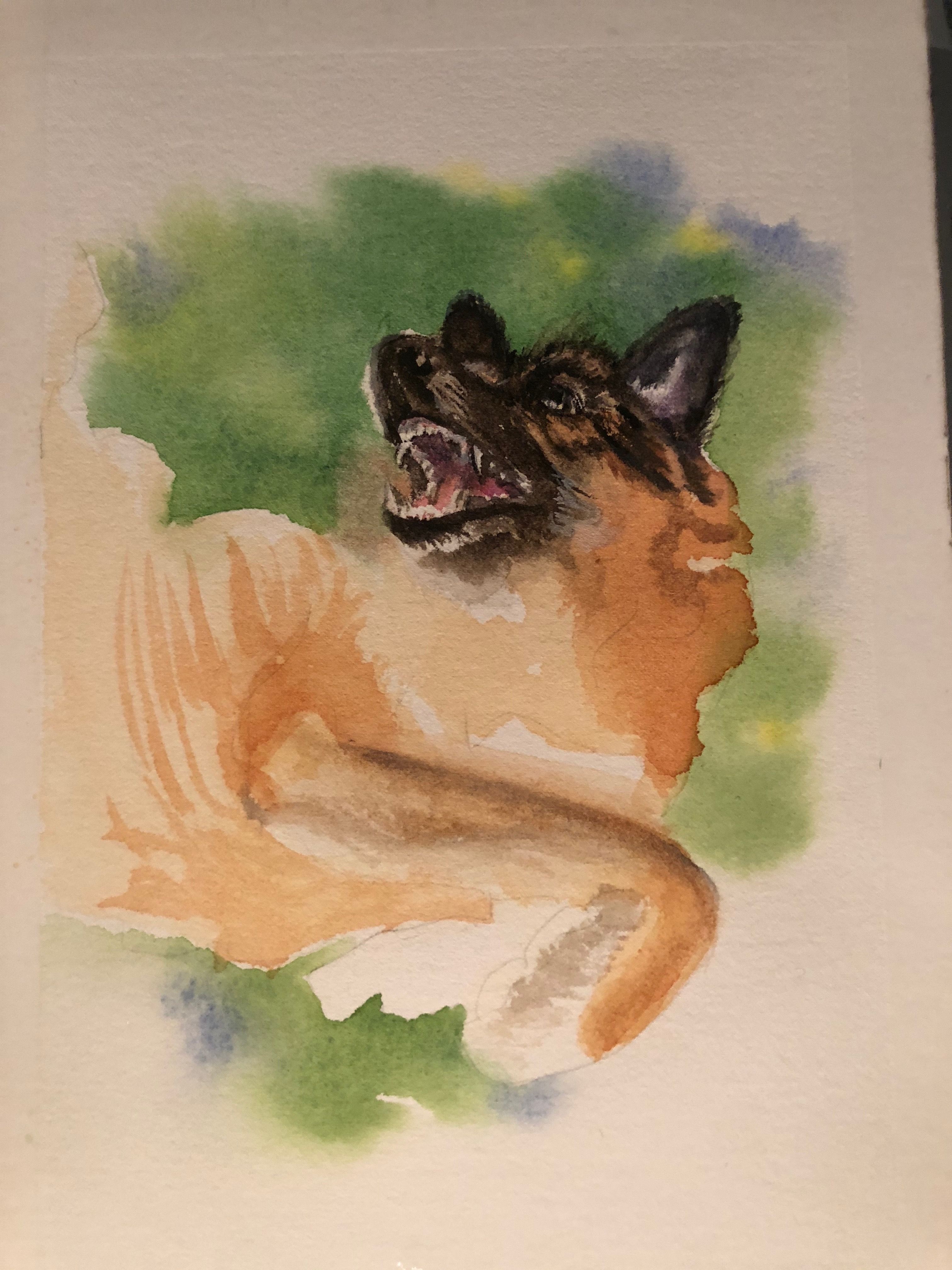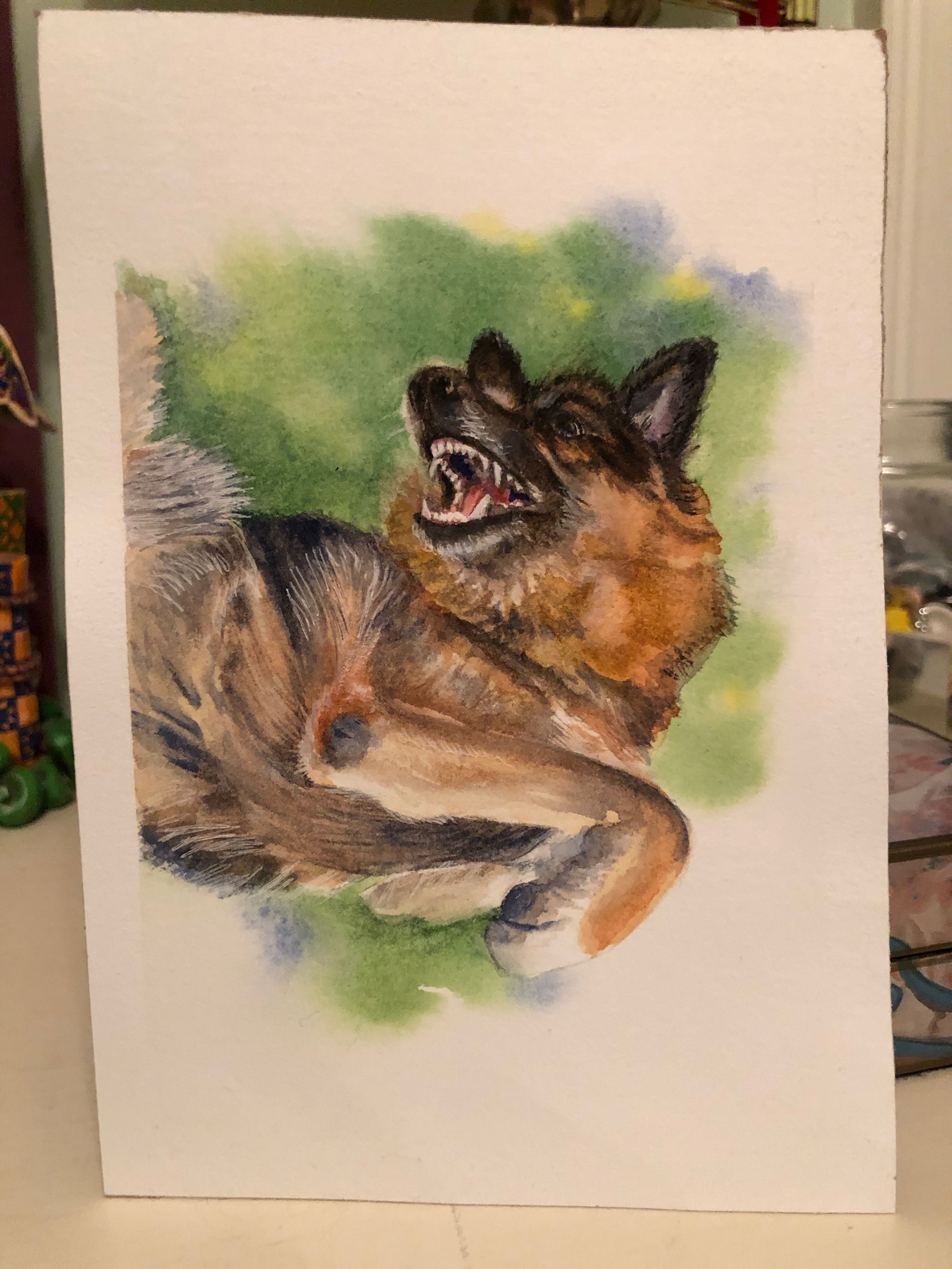 @sarah_stokes Obrigado! Eu amo Turbo (ele é um resgate sênior do GSD que está prosperando em uma casa permanente agora), mas parece sobrecarregado e um pouco enlameado quando olho para o produto acabado. Tentei usar uma paleta limitada e secar entre as camadas, mas ainda estou lutando com a transparência que amo na aquarela.