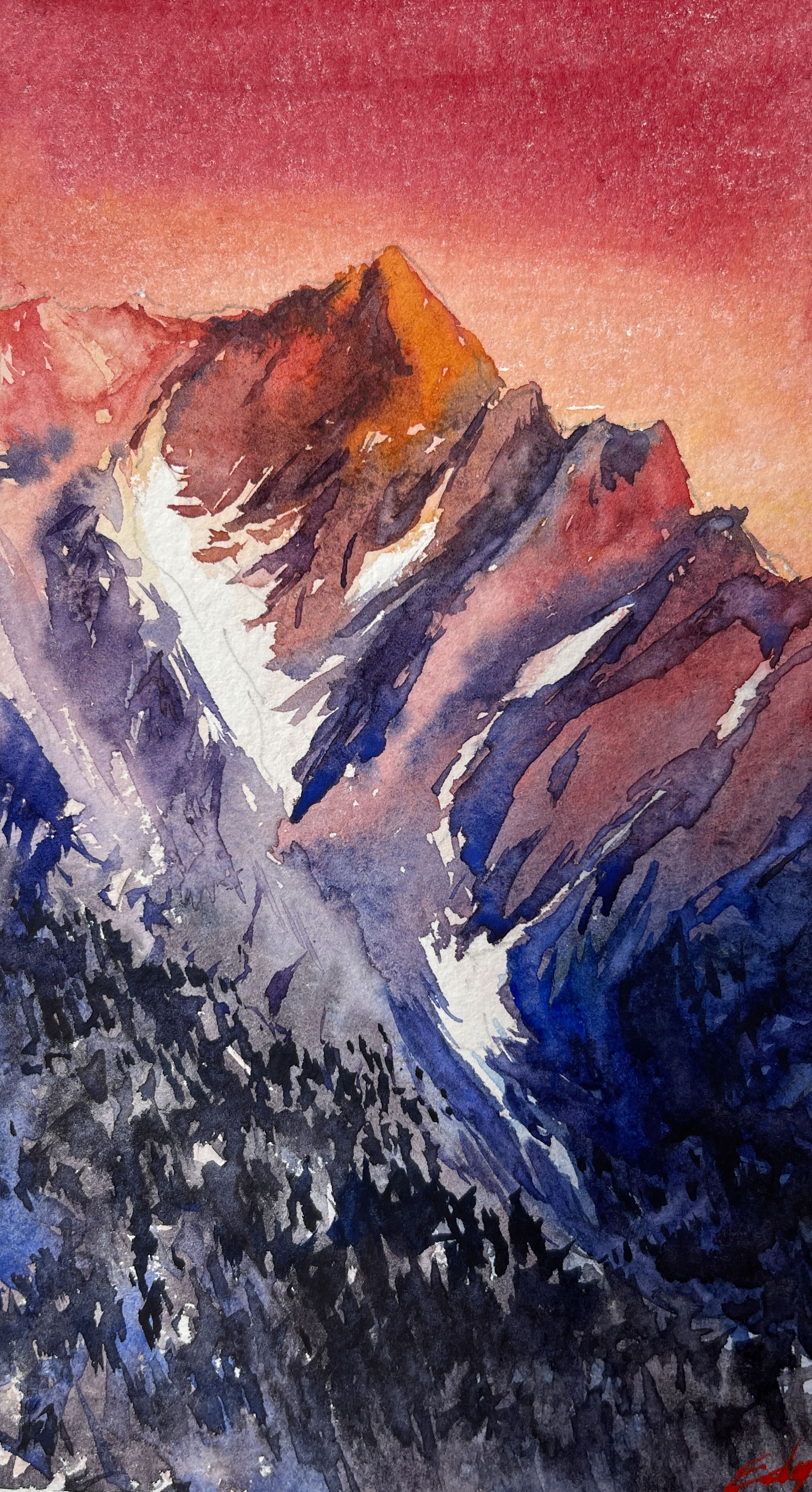 Los nevados son parte de mi día a día, he crecido viéndolos siempre, pintar este atardecer entre montañas con acuarelas hace que me conecte más con ellos. Lo que me ha gustado de esta obra es lograr la transición de colores cálidos a fríos, como se puede observar de arriba hacia abajo, así también con trazos rápidos los detalles de toda la obra.