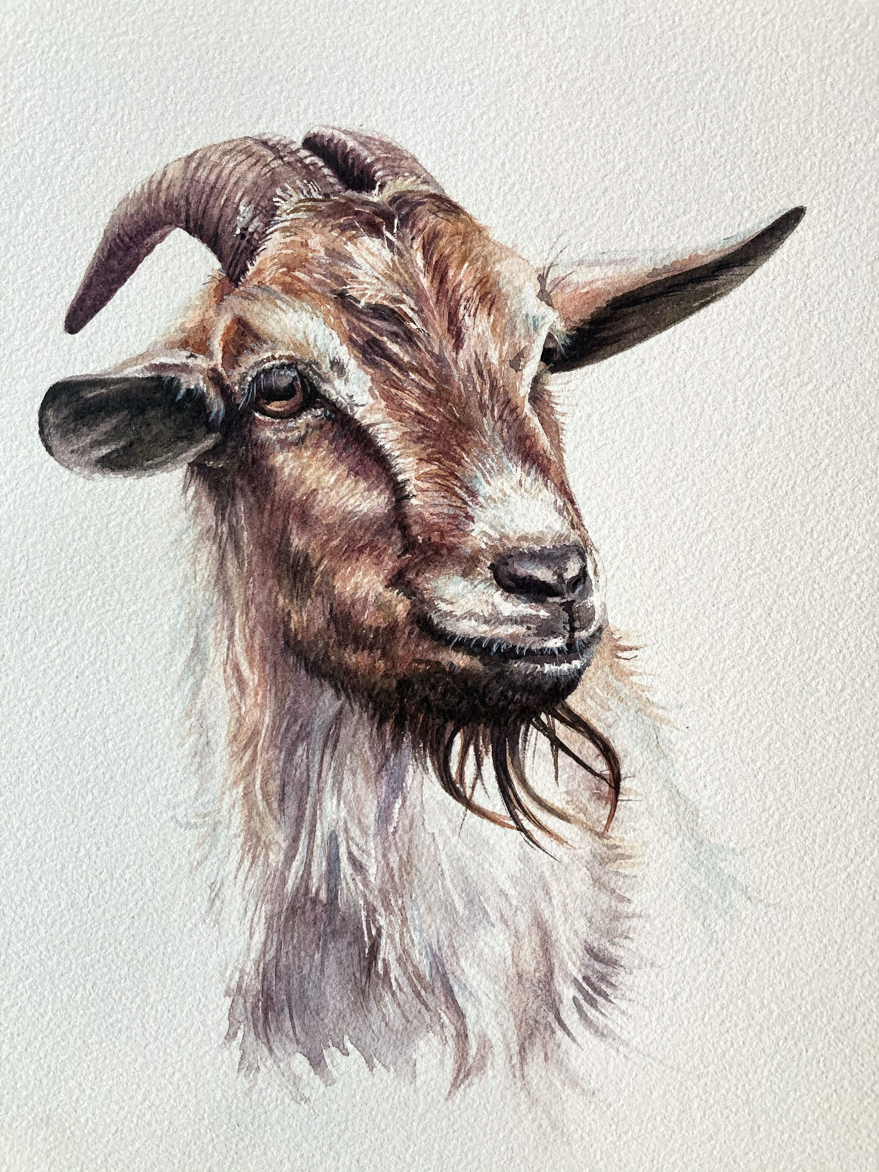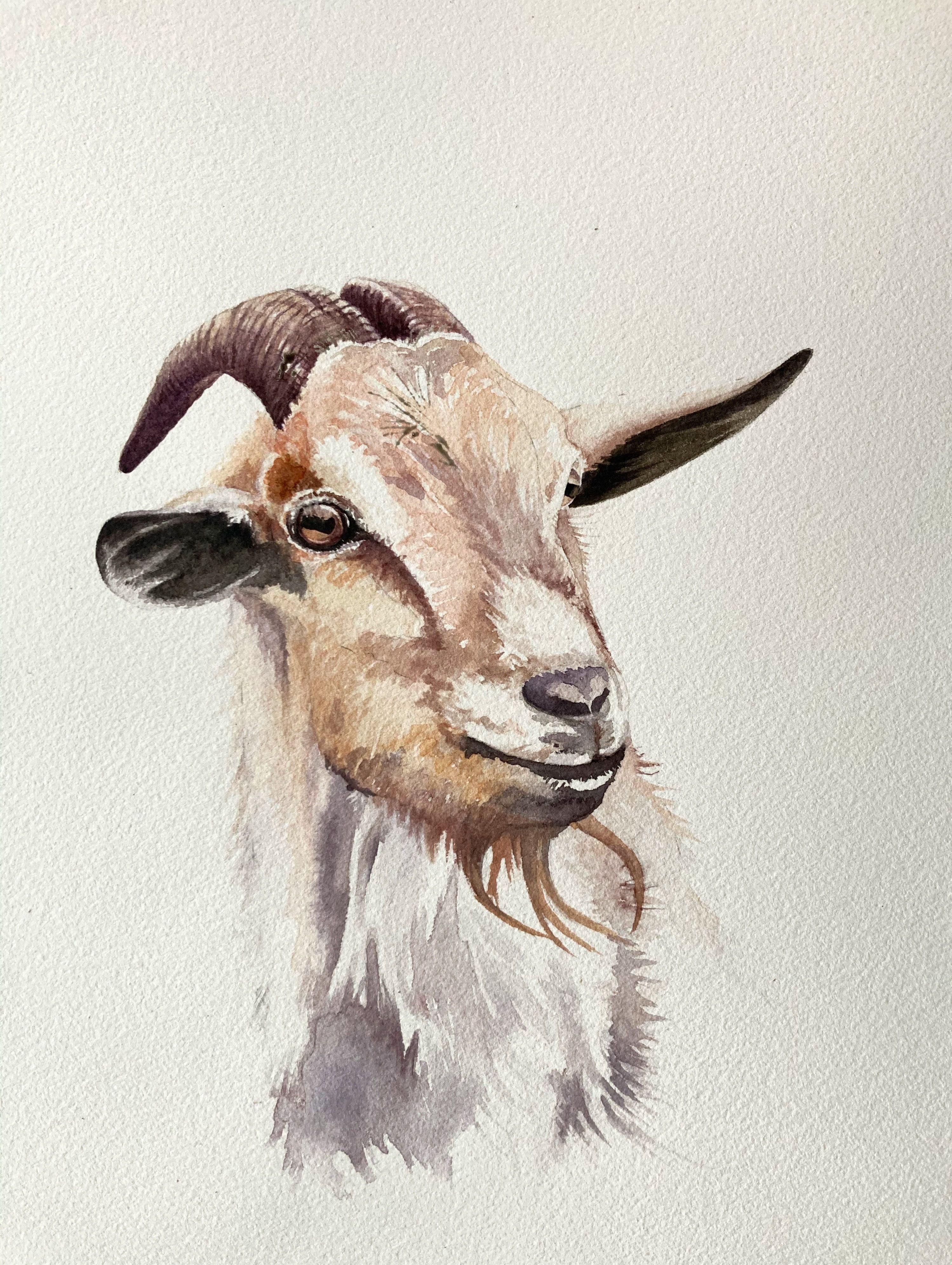 I finished painting this goat a few weeks ago but have been hesitant to upload the picture. I think I have very high expectations of my work and when I look at the painting I keep seeing things I would like to be different. For example, I wish I had a looser, more flowing style. But now I've decided to just take that first step and upload the image as my first project, knowing that this is just the start and I can develop my art from here. And I think this cheeky goat deserves to make an appearance in the world, even if it doesn't meet all my standards yet, I still like the colour palette and the expression of the goat.