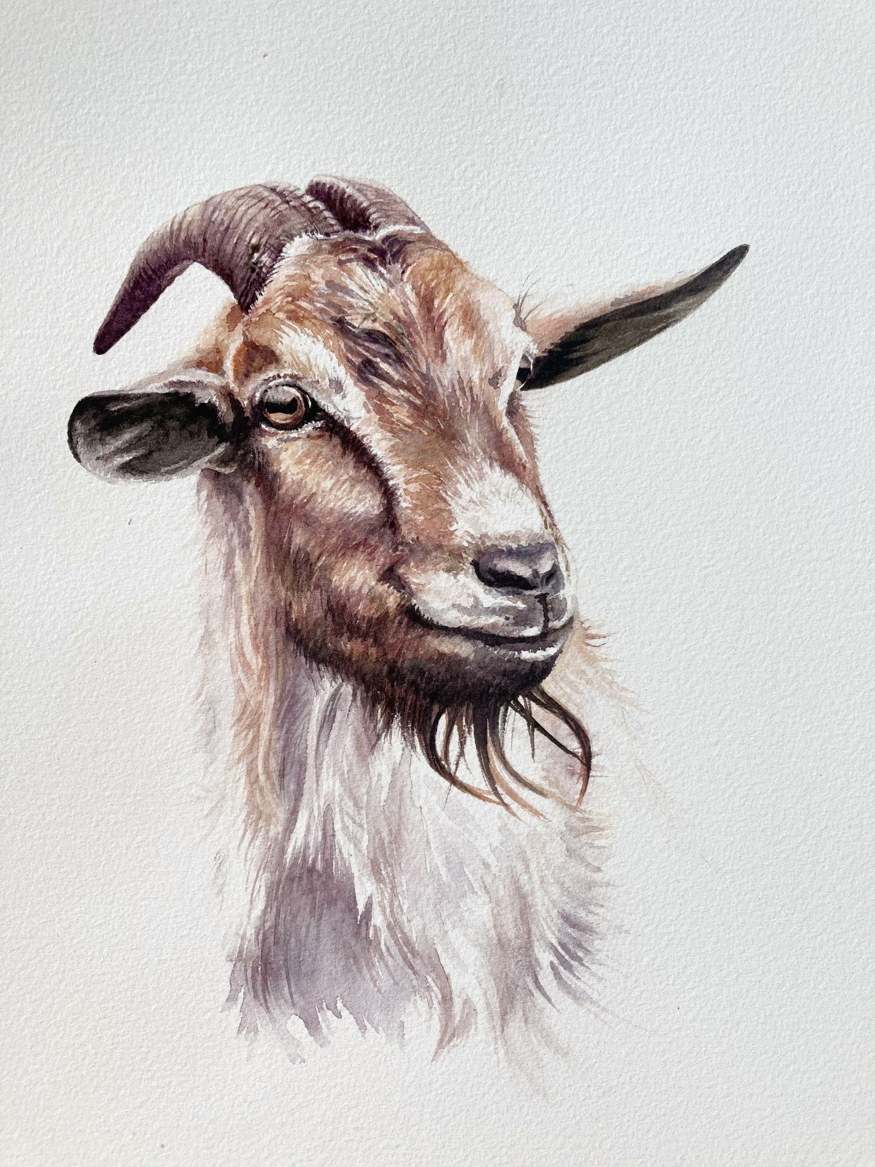 Terminei de pintar esta cabra há algumas semanas, mas tenho hesitado em publicar a imagem. Acho que tenho expectativas muito altas em relação ao meu trabalho e, quando olho para a pintura, continuo a ver coisas que gostaria que fossem diferentes. Por exemplo, gostaria de ter um estilo mais solto e fluido. Mas agora decidi dar o primeiro passo e publicar a imagem como meu primeiro projeto, sabendo que este é apenas o começo e que posso desenvolver minha arte a partir daqui. E acho que esta cabra atrevida merece aparecer no mundo, mesmo que ainda não atenda a todos os meus padrões, ainda gosto da paleta de cores e da expressão da cabra.
