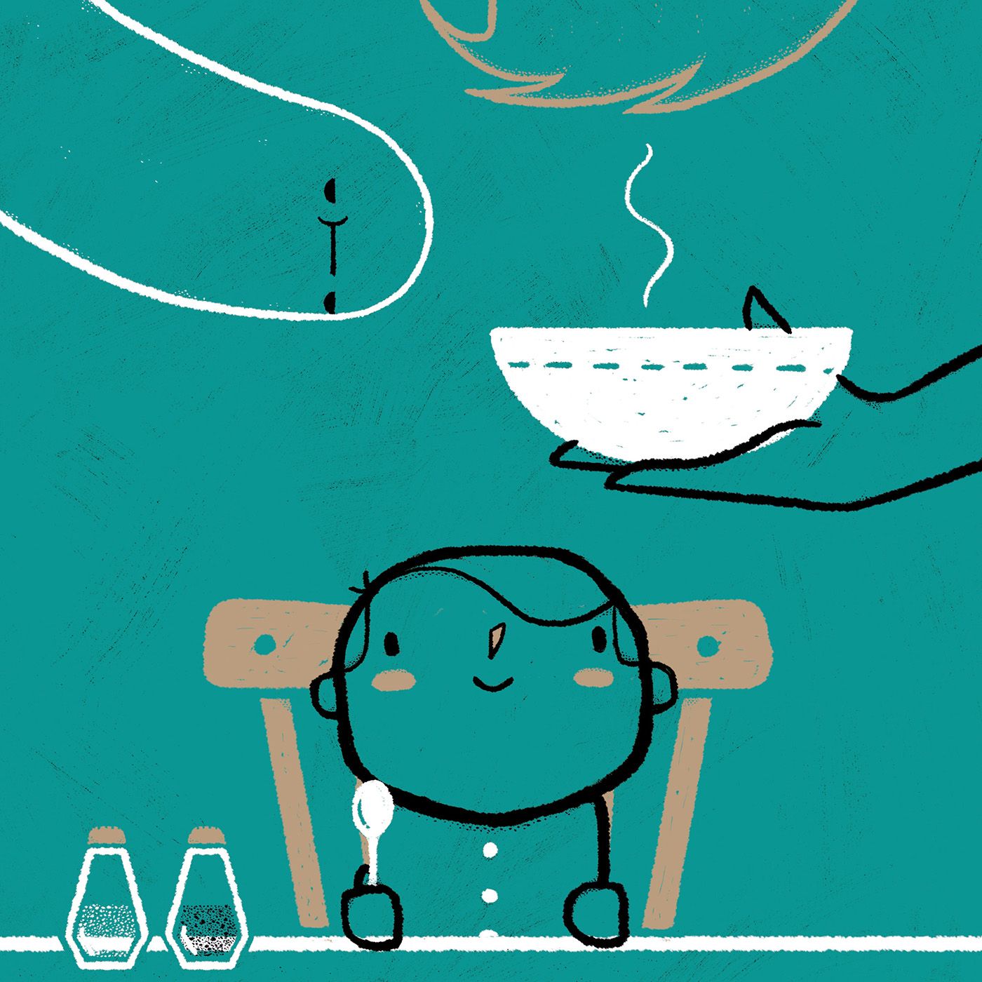 Para elaborar las ilustraciones creé un pincel de Photoshop y aproveché algunas texturas de ruido que tenía en una vieja biblioteca. Por otro lado usé una gama de colores que ya había trabajado en algunas de las invitaciones que hice para el cumpleaños de Fermín. Era importante que encontrara a los personajes familiares y cercanos y ese fue la mayor de mis preocupaciones cuando los diseñé.