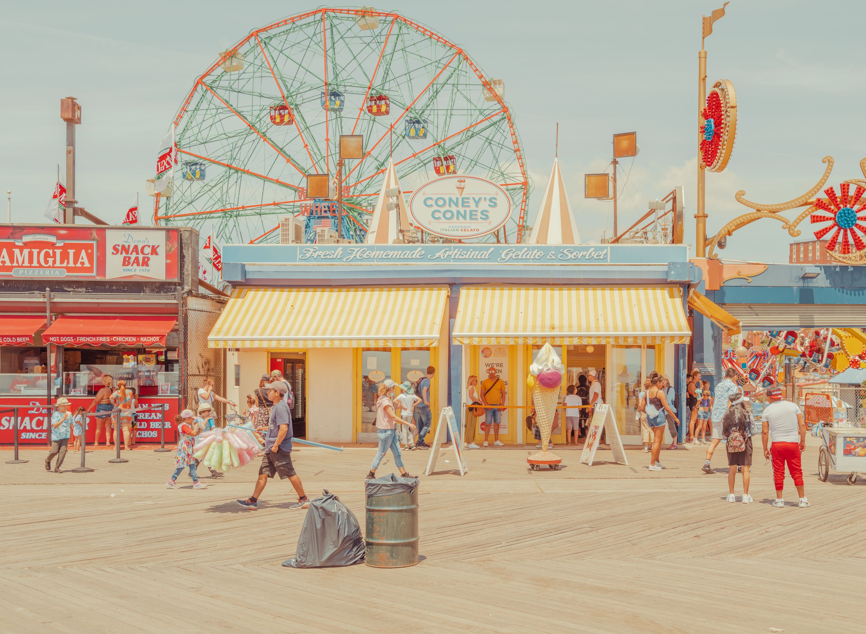 Coney Island fica a 1 hora de Nova York de metrô e tem sua população dobrada nos fins de semana de verão, as pessoas vêm para passar um tempo com suas famílias na praia ou nos parques de diversão que ficam no calçadão, eu queria fazer essa série porque as cores das atrações e barracas contrastam com a cor de tijolos dos prédios ao fundo.