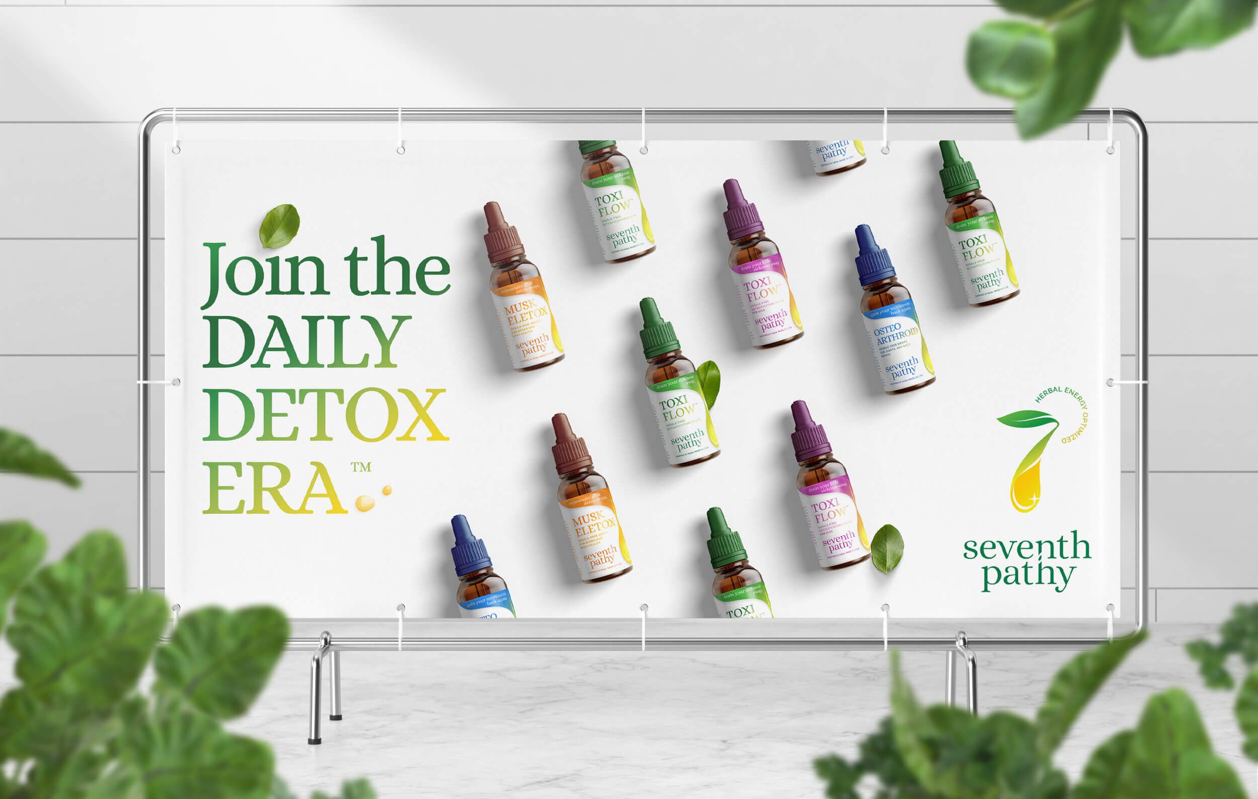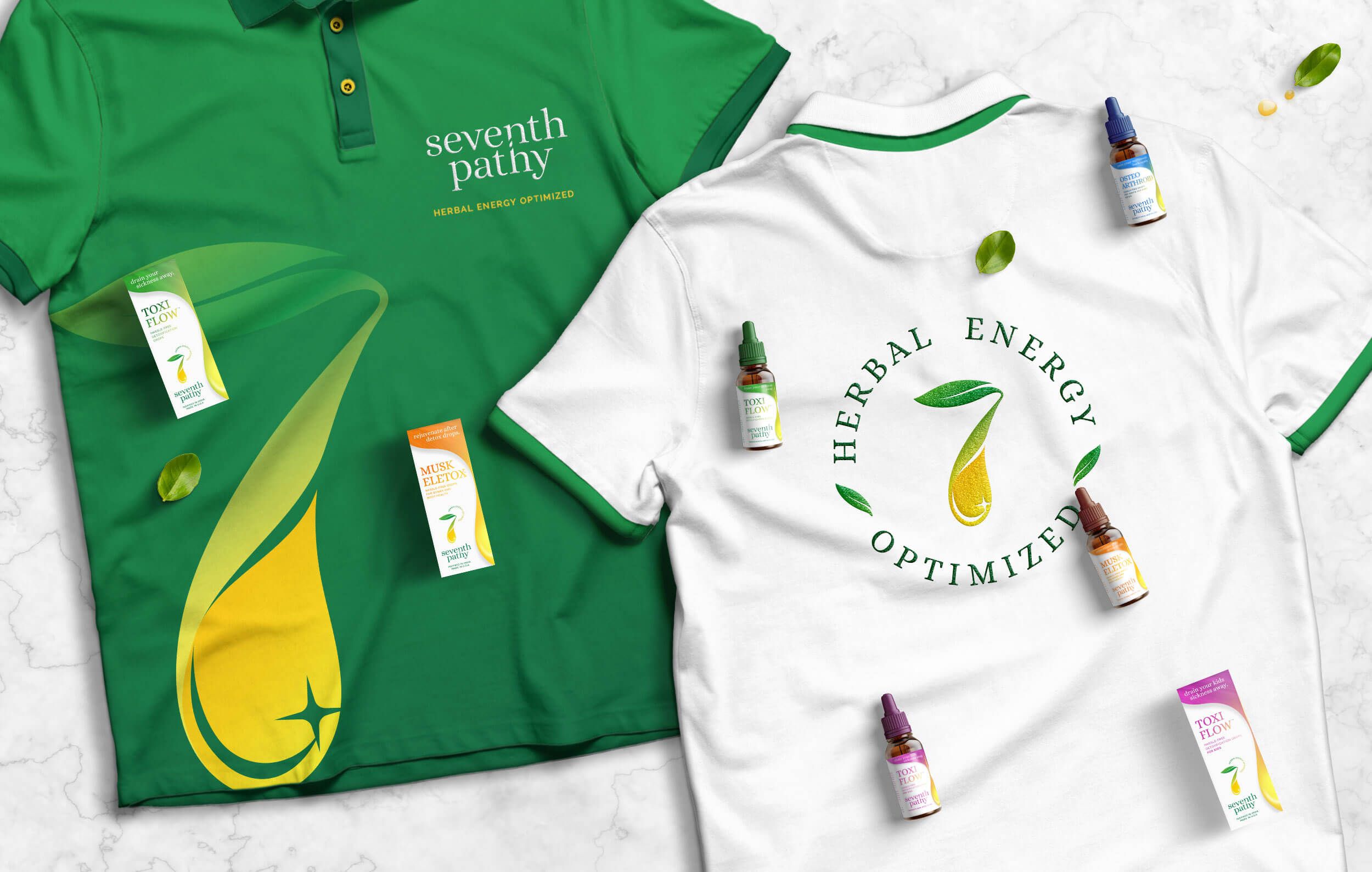 The tagline, Herbal Energy Optimised was designed to be used in two forms. One as a circle to represent the sun; adaptable on both the logomark as well as the logotype or as a line below Seventh Pathy when space was limited.
