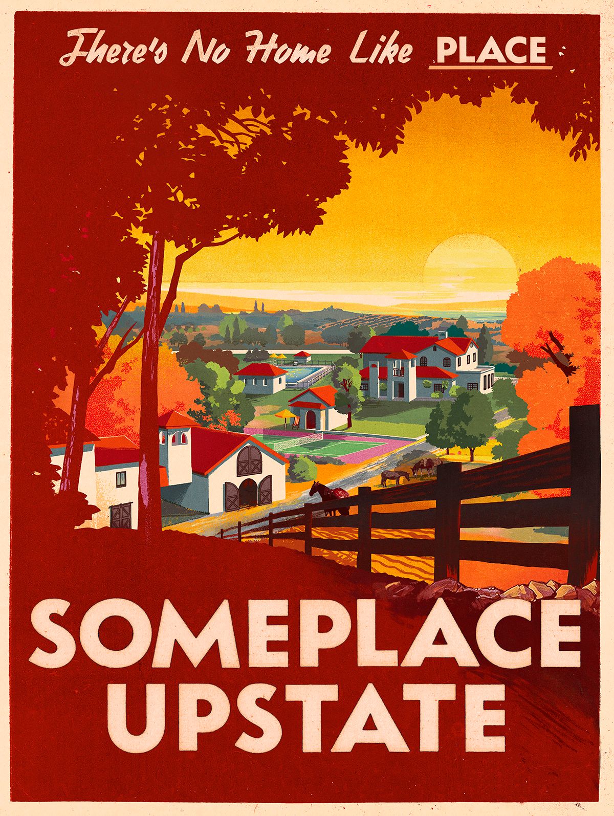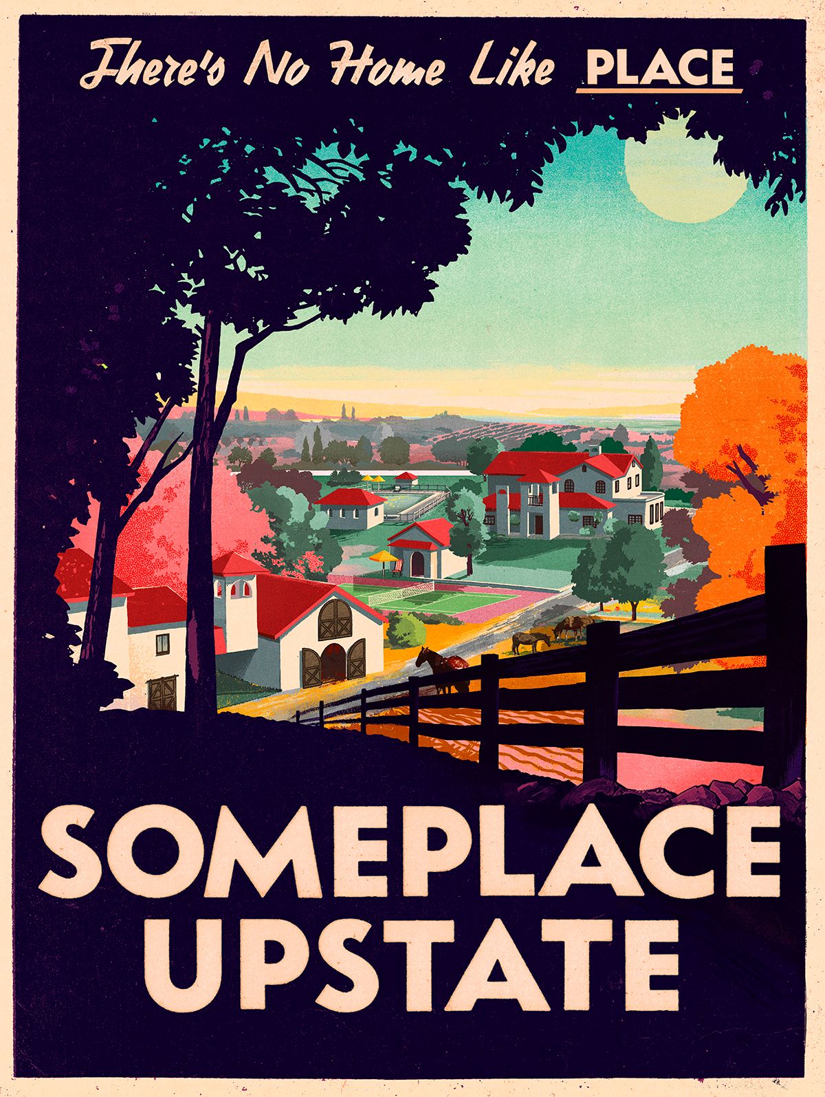 Série de pôsteres seguindo a tradição gráfica do 'Travel Poster' para Someplace Upstate , um rancho/resort dos sonhos localizado em Marlboro, no interior do estado de Nova York, bem no coração do Vale do Hudson.