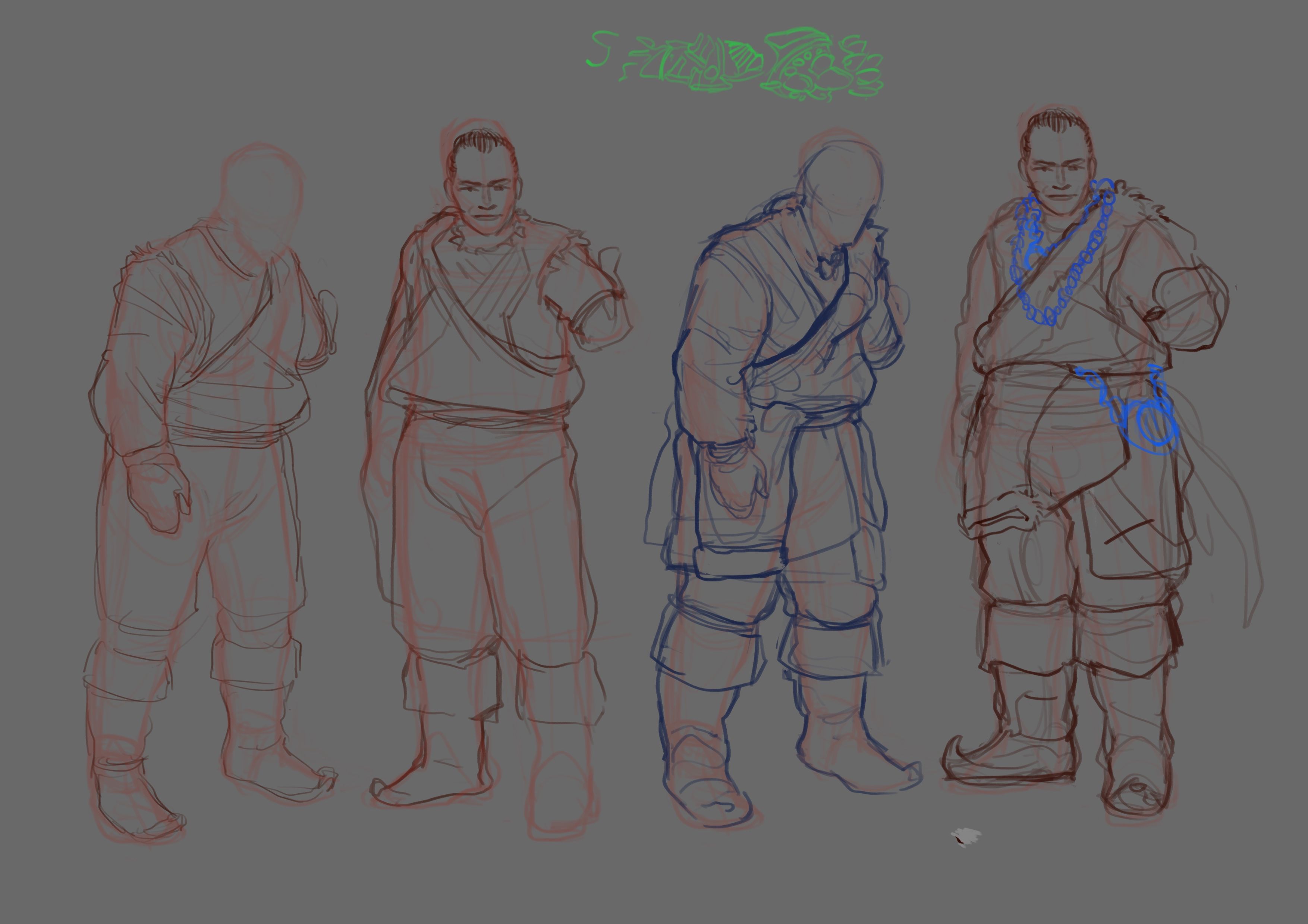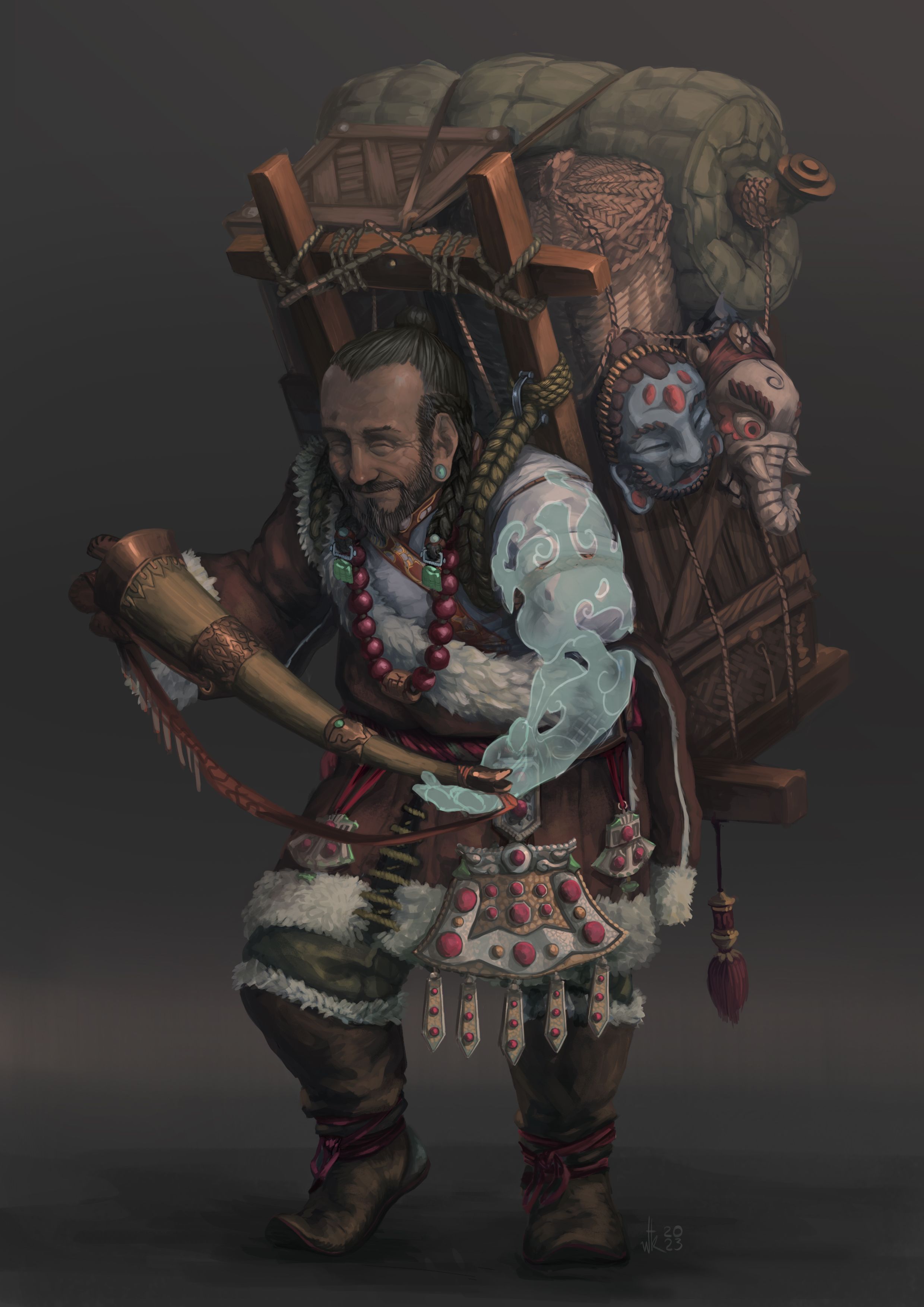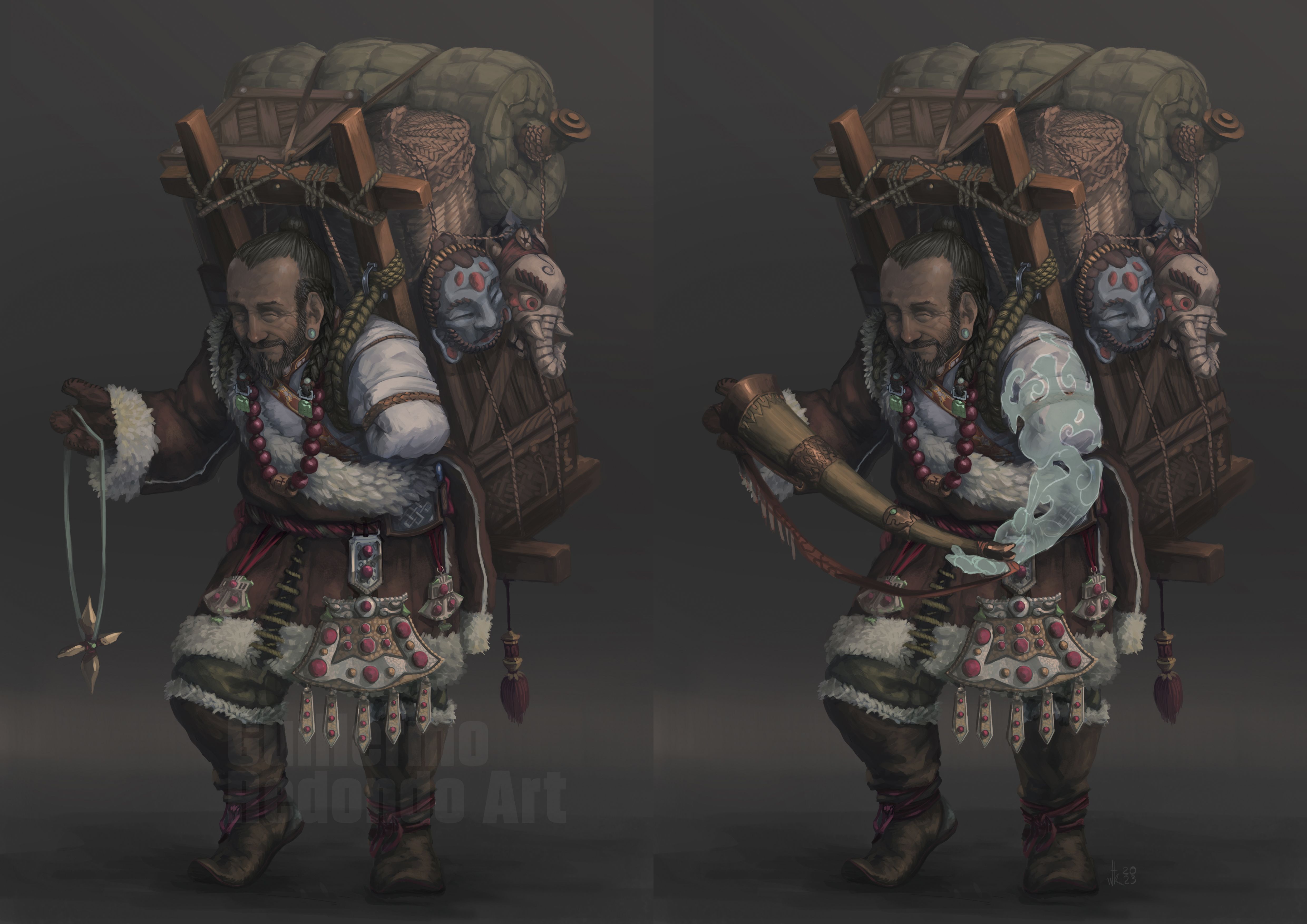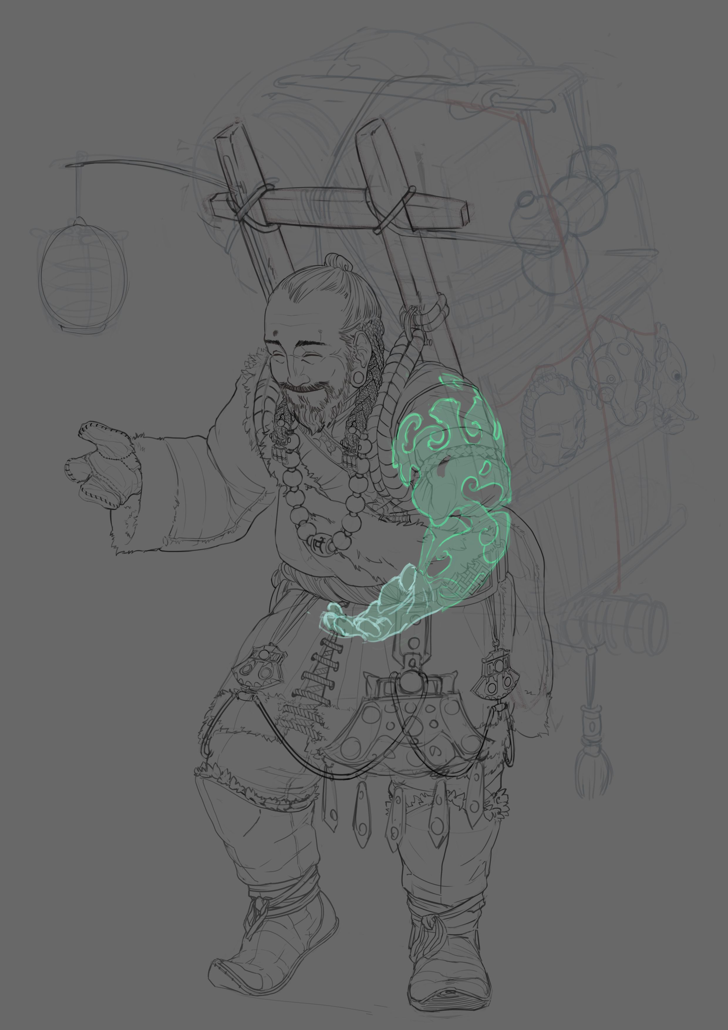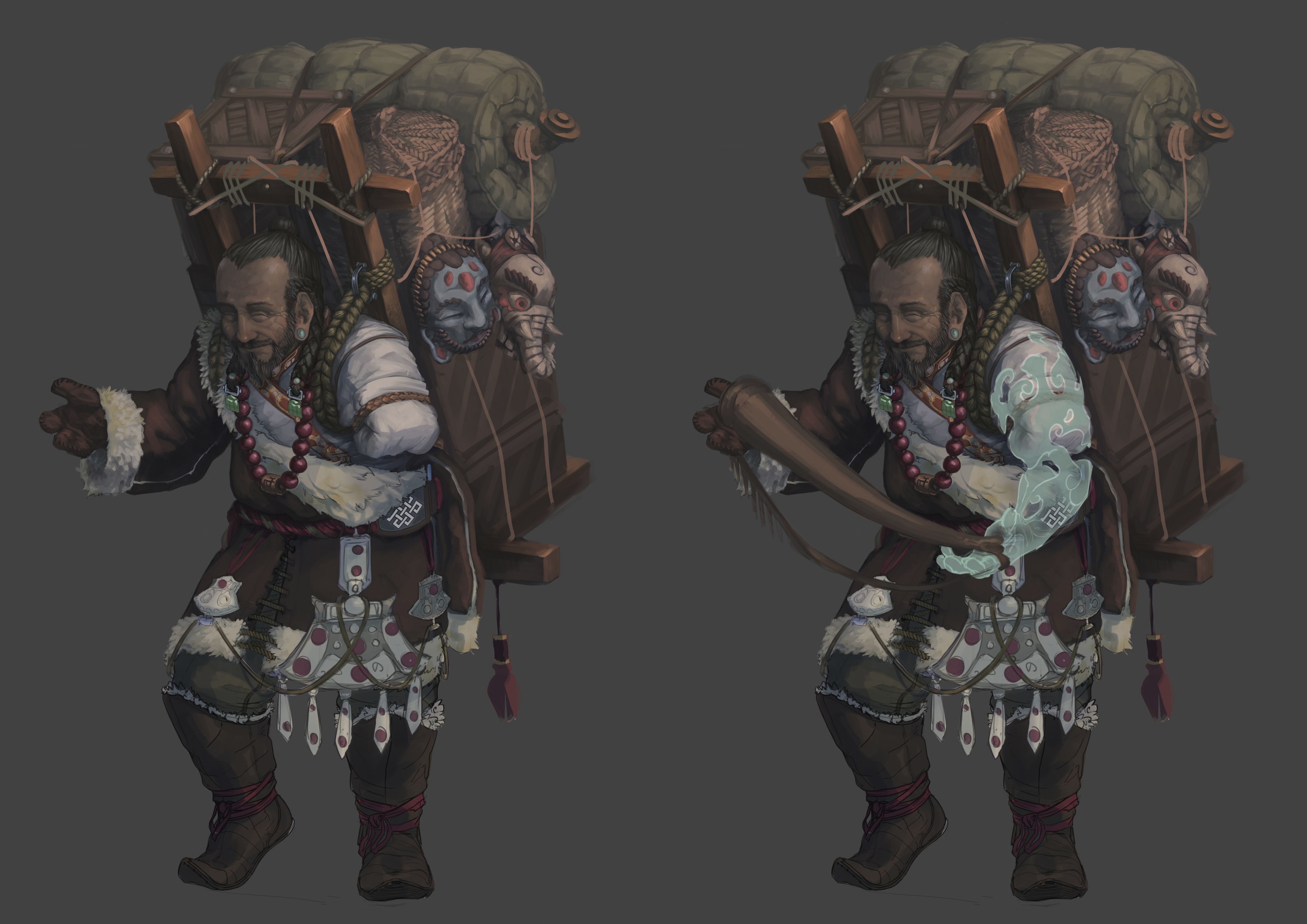 Designing the load he would carry was a difficult task, as you can see in his different variations throughout the process. I wanted to show a great weight on his back but I didn't want it to look unrealistic either.