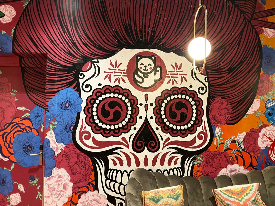 Un inmenso mural captura la esencia de este diálogo: dos imponentes catrinas dominan la escena. Una de ellas, reinventada y transformada, adopta la delicadeza y misterio de una geisha moderna. A su alrededor, un mosaico de elementos icónicos cobra vida: desde las vibrantes flores mexicanas hasta los etéreos fantasmas mitológicos de Japón. Cada detalle, cada trazo, construye una narrativa surrealista, en la que dos culturas, que a simple vista podrían parecer mundos aparte, coexisten en una armonía sorprendentemente fluida y natural.