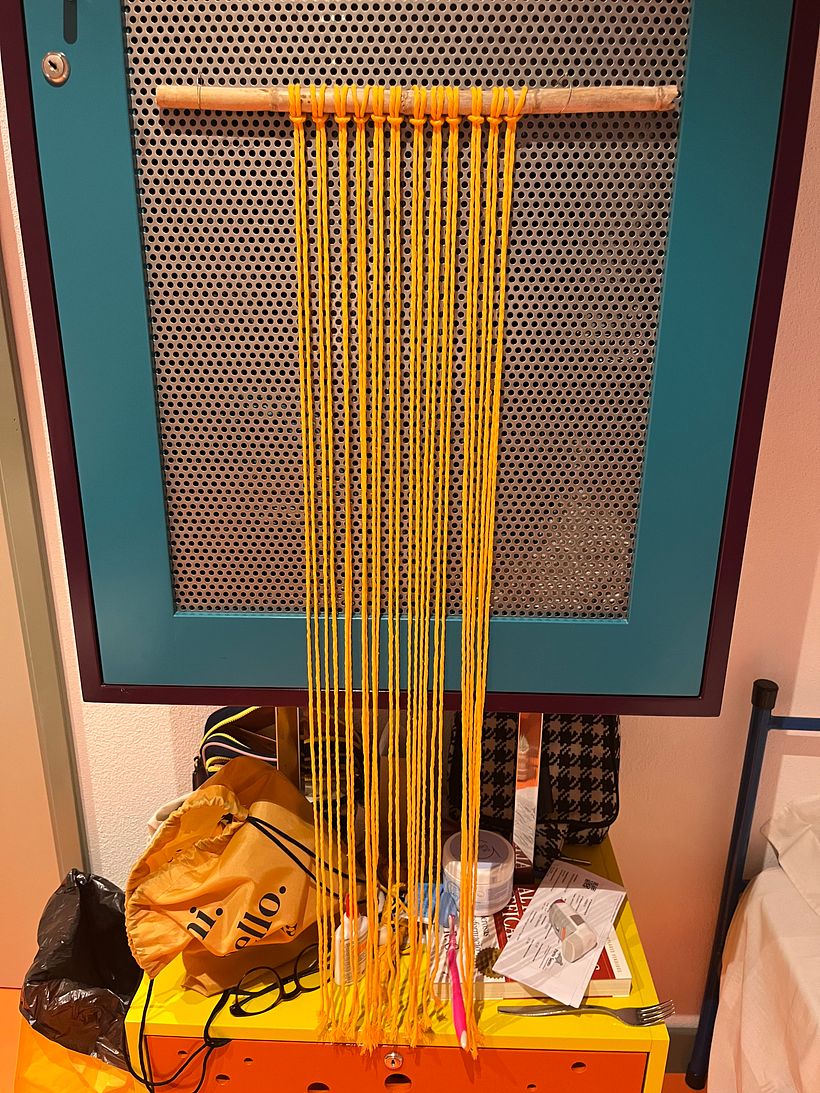 Este projeto foi realizado durante uma tempestade tropical, na ilha do Porto Santo, arquipélago da Madeira, portugal. Estava de férias e antes da tempestade chegar, pois não iríamos poder sair do quarto, comprei o fio de algodão e apanhei uma cana de bambu na praia. Pendurei a cana com as minhas argolas das orelhas, enfiando nos buracos do armário, e assim fiz a primeira peça. Já fiz mais entretanto com pontos mais elaborados. Obrigada.