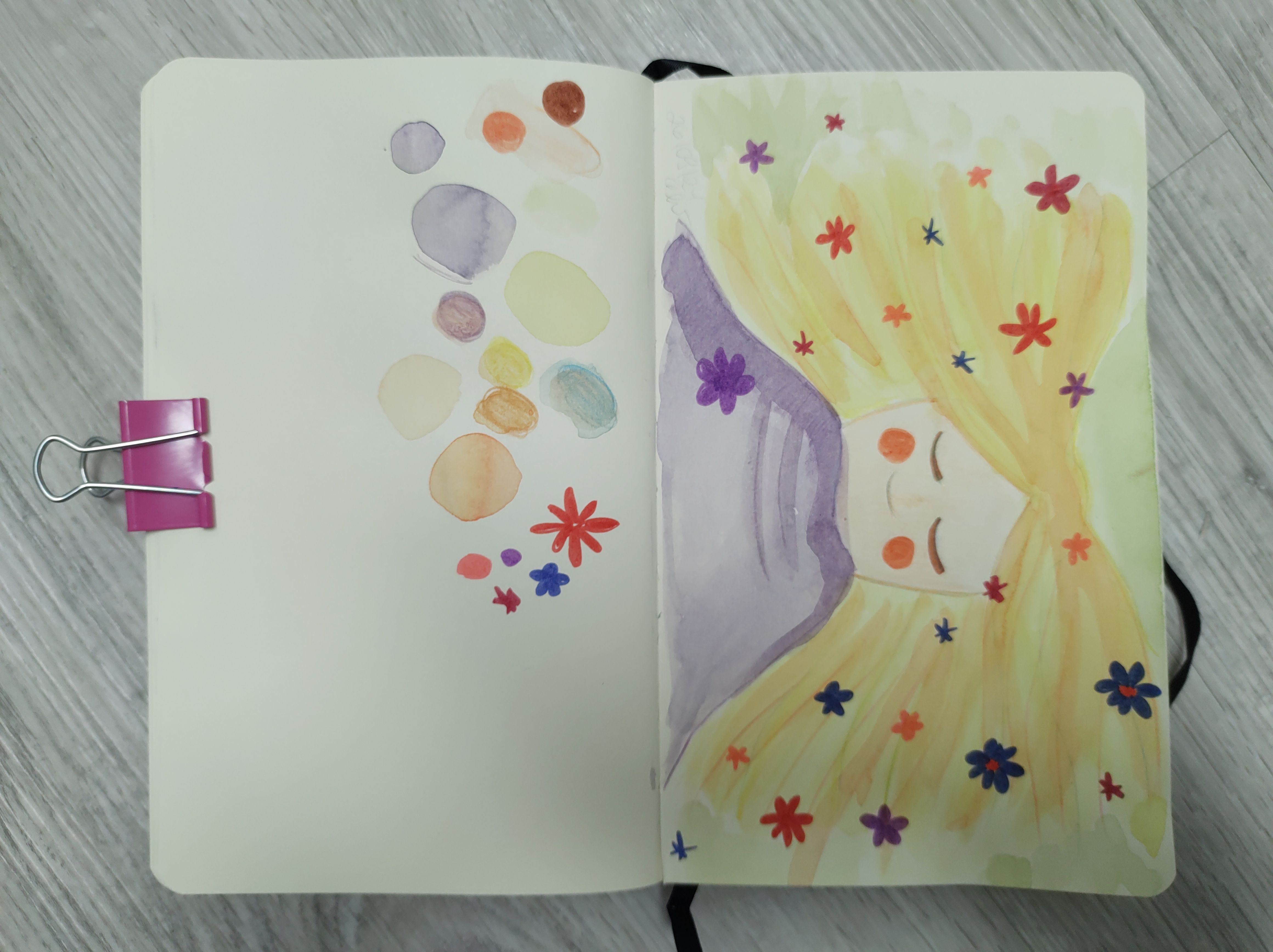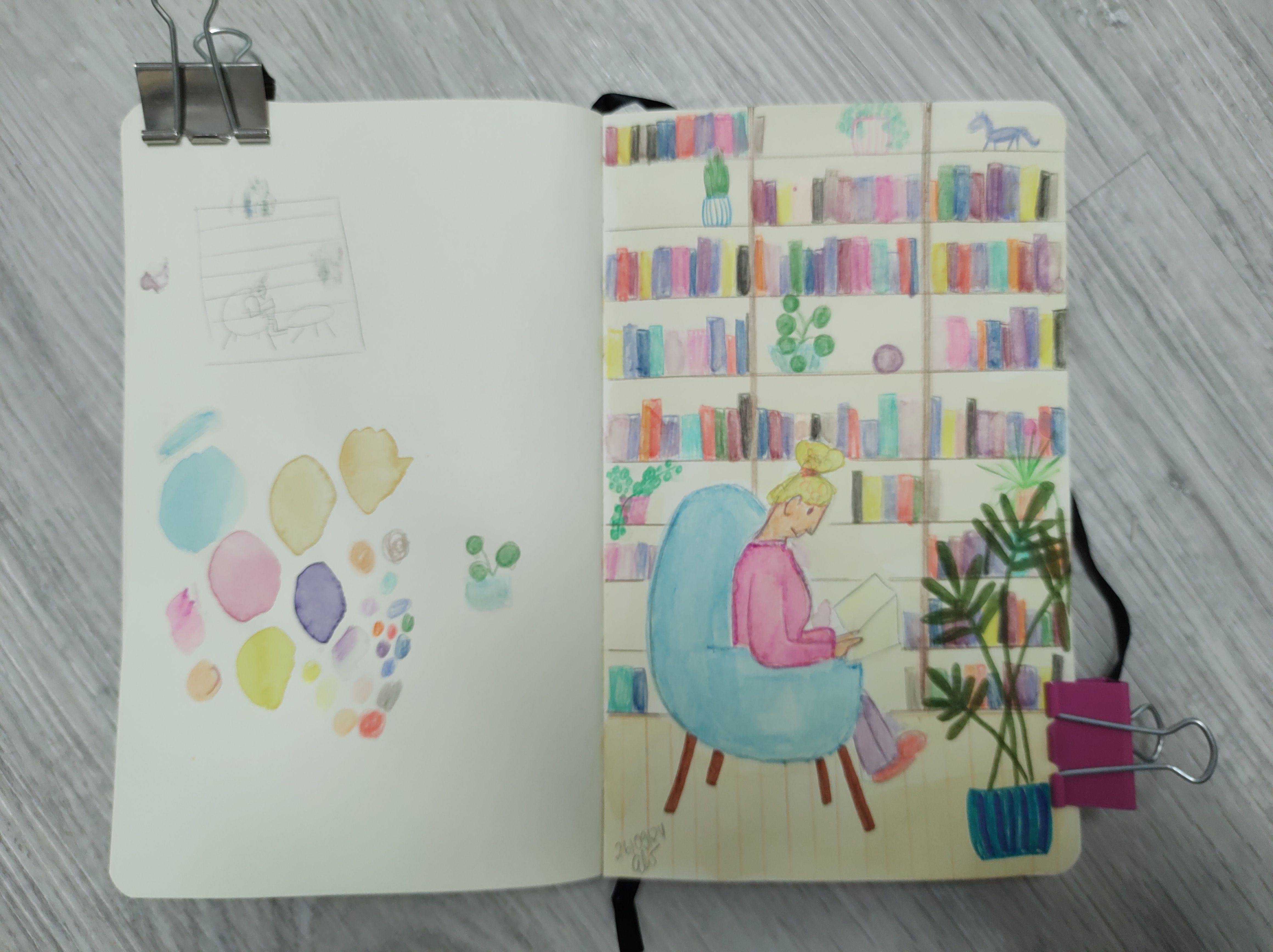 Belos esboços! As cores são muito aconchegantes e suaves. O esboço do personagem lendo é o meu favorito.