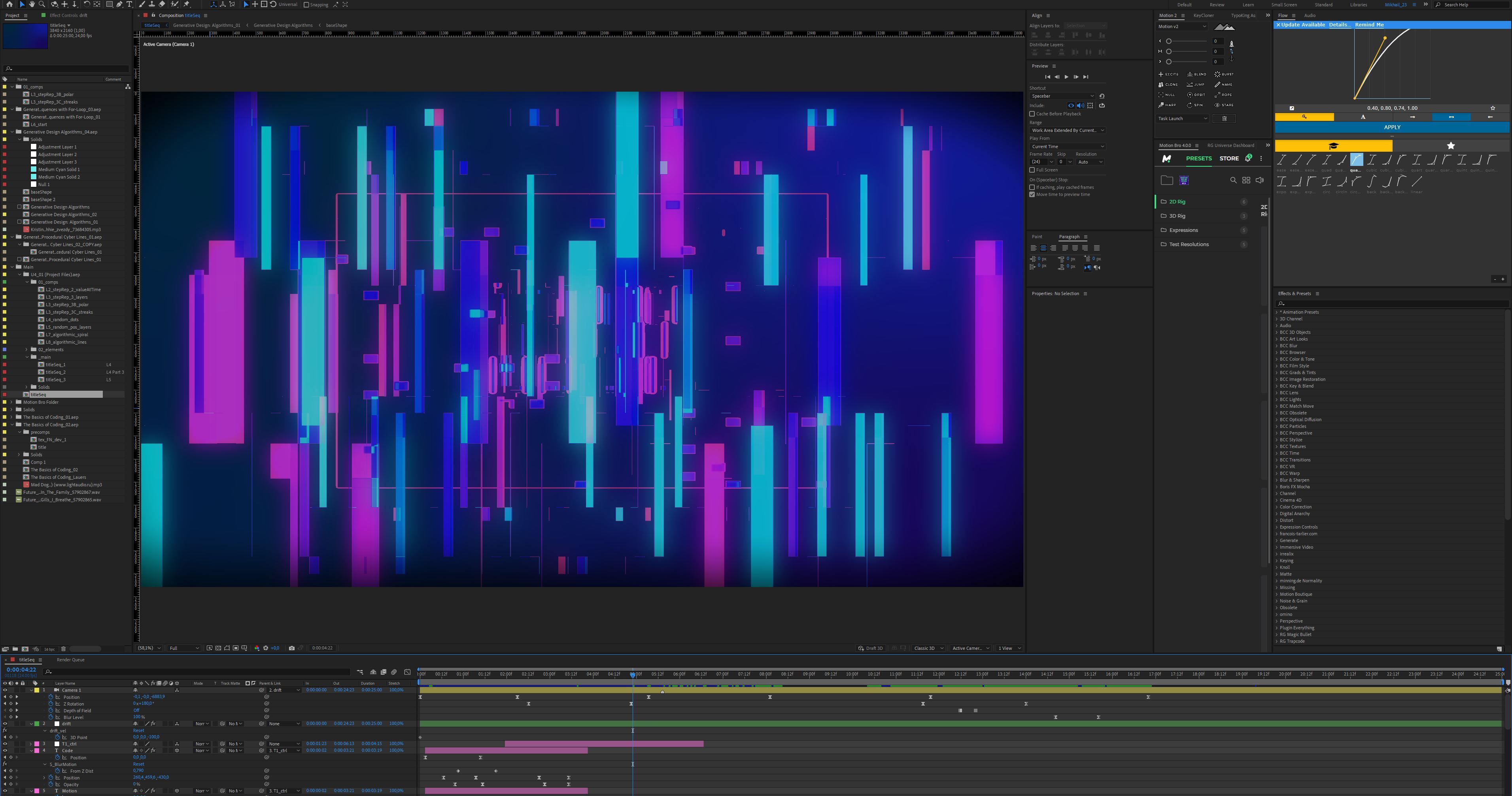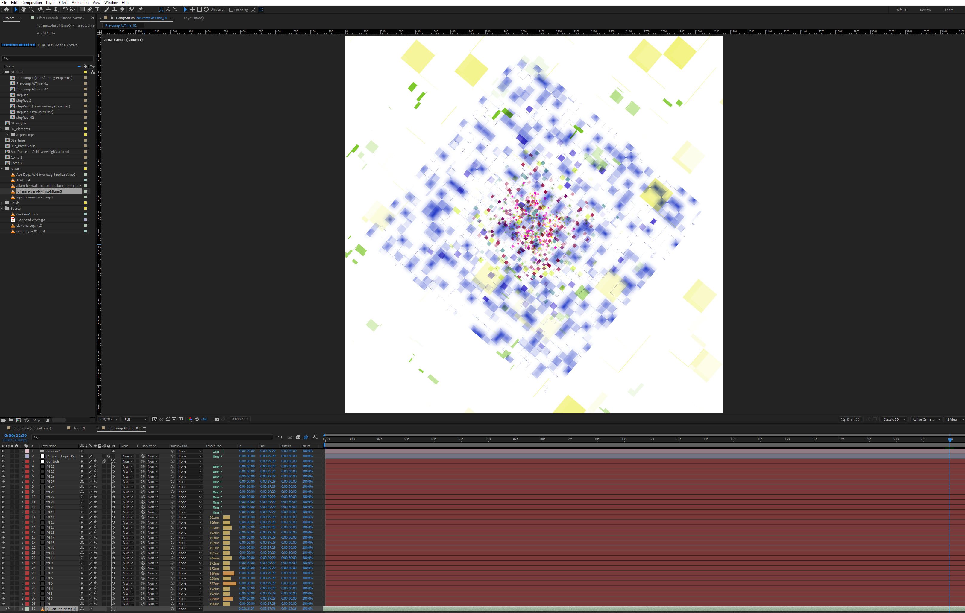 I created geometric shapes through procedural generation techniques, using step repetition, randomization, and valueAtTime expressions.
