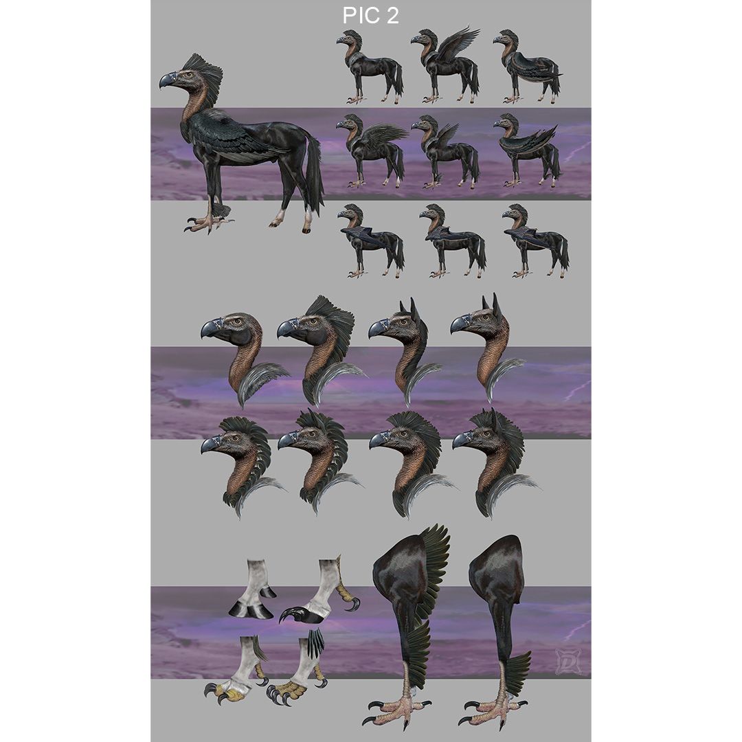 O objetivo deste projeto era pegar um conceito de criatura que eu havia projetado e levar suas iterações adiante, a fim de potencialmente esculpi-lo digitalmente no futuro. O estilo de escultura pretendido era ser bastante fotorrealista, então a ideia de abordá-lo de forma científica me veio à mente. Daí a descoberta do curso Domestika mencionado anteriormente. Como o conceito inicial era ser uma variação da criatura mitológica, o Hipogrifo, muitos dos conceitos iniciais foram construídos através do método photo-bash no Adobe Photoshop (ref.: imagem 2). Isso se deve ao fato de a criatura fantástica em questão ser essencialmente a combinação de dois animais existentes.