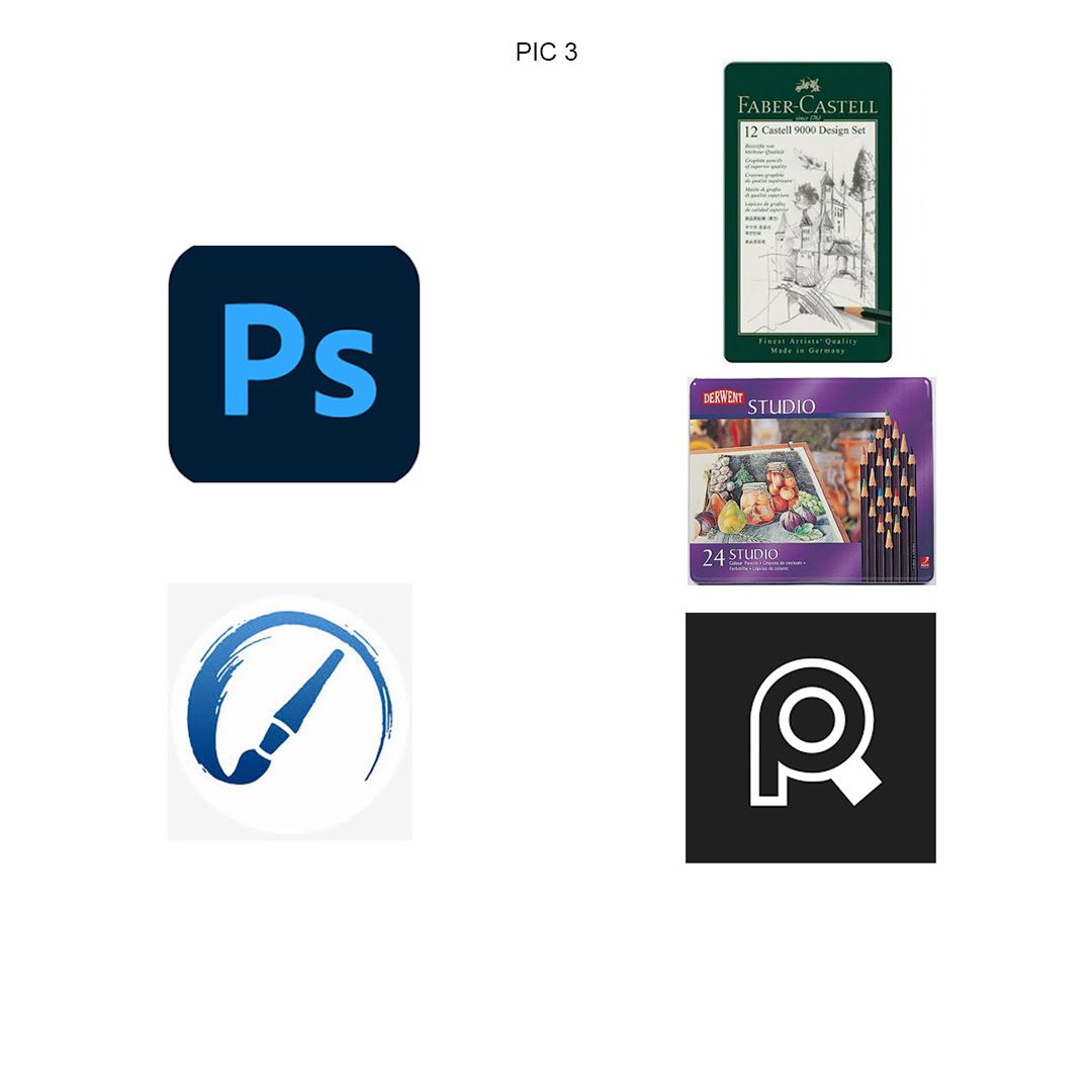 As previously mentioned the initial designs were photo-bashed in Photoshop, redrawn traditionally using Derwent Studio colored pencils and Faber Castell graphite 9000 pencils then scanned into Rebelle for painting and finally imported back into Photoshop for post editing. Throughout the process the application Pureref was used when enquiring photo references.(ref pic3)
