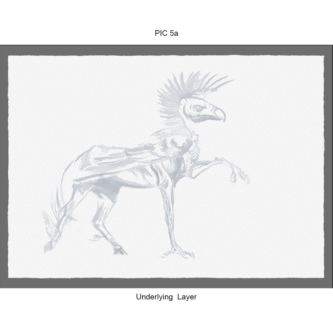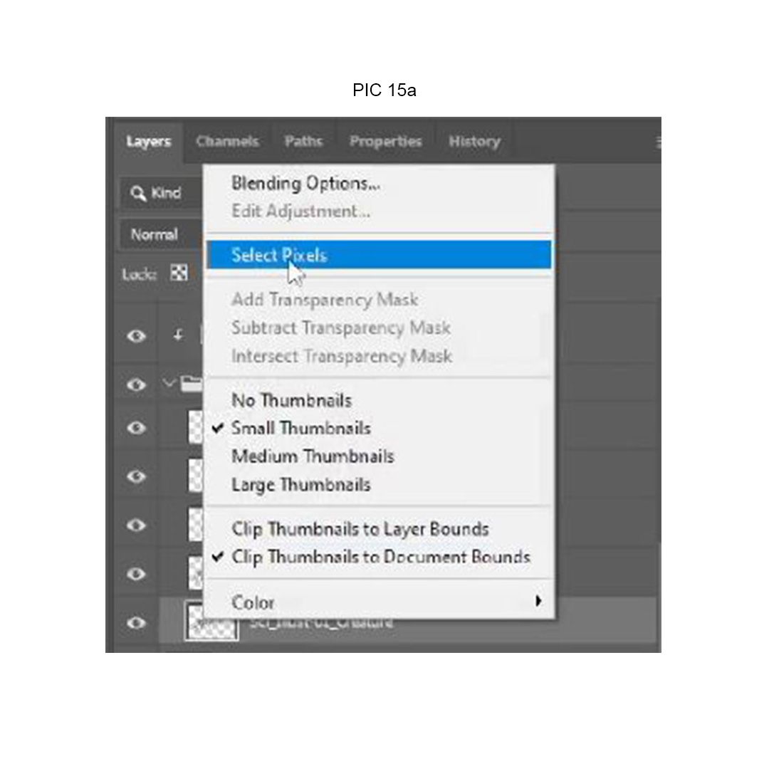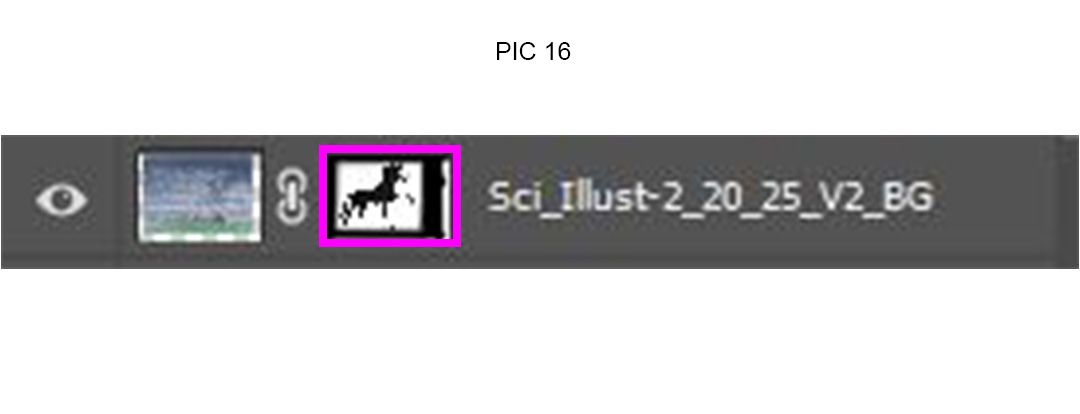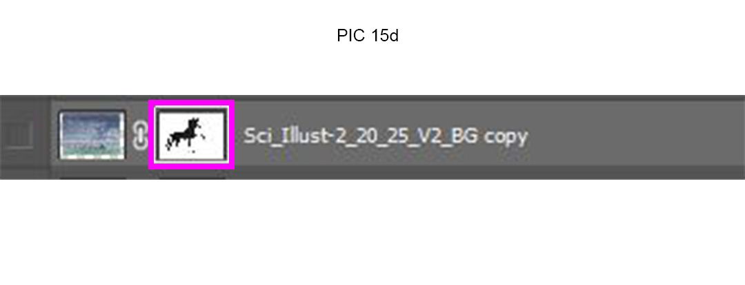 Once the images were completed in Rebelle they were saved as JPEGS “File-Save As” and imported into Photoshop“ File-Place Embedded”.As previously mentioned the Rebelle files were set to semi-transparent mode which caused an unwanted blend of the animal and background. To remedy this the foreground layer icon was selected then “Right-Click-Select Pixels”. (pic 15 a) With the selection active flashing with its dotted lines (ref pic 15b) the background layer (which should be ideally underneath the foreground layer) was selected and then select the layer mask icon.(ref pic 15c)