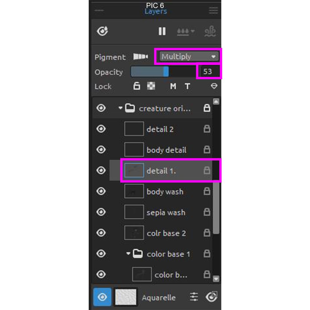 Para obter resultados semelhantes a partir do material de origem analógico, as técnicas que utilizei foram praticamente idênticas às do curso original da Domestika, como as fases de subjacência, lavagem de cor e detalhamento da pintura (ref. foto 5a, b, c). Com a principal exceção, as etapas foram criadas em camadas separadas; portanto, à medida que a ilustração progredia, as opacidades e os modos da camada subjacente eram ajustados em relação às camadas acima delas (ref. foto 6). Assim como em sua contraparte tradicional, o modo aquarela foi definido como "semitransparente" (ref. foto 7) para que a cor abaixo pudesse transparecer.
