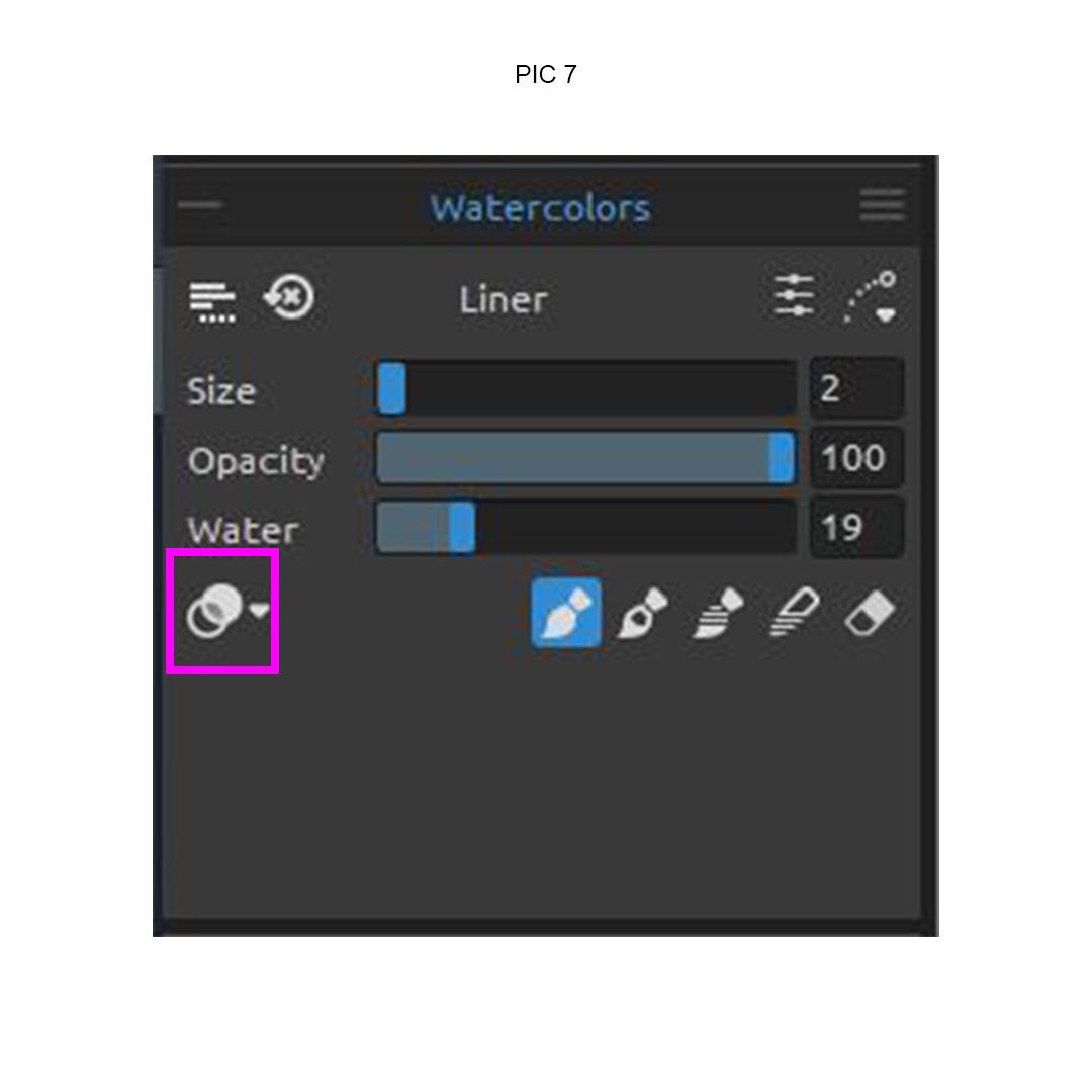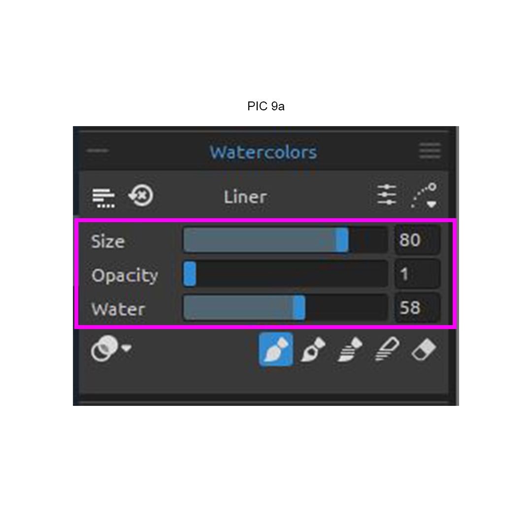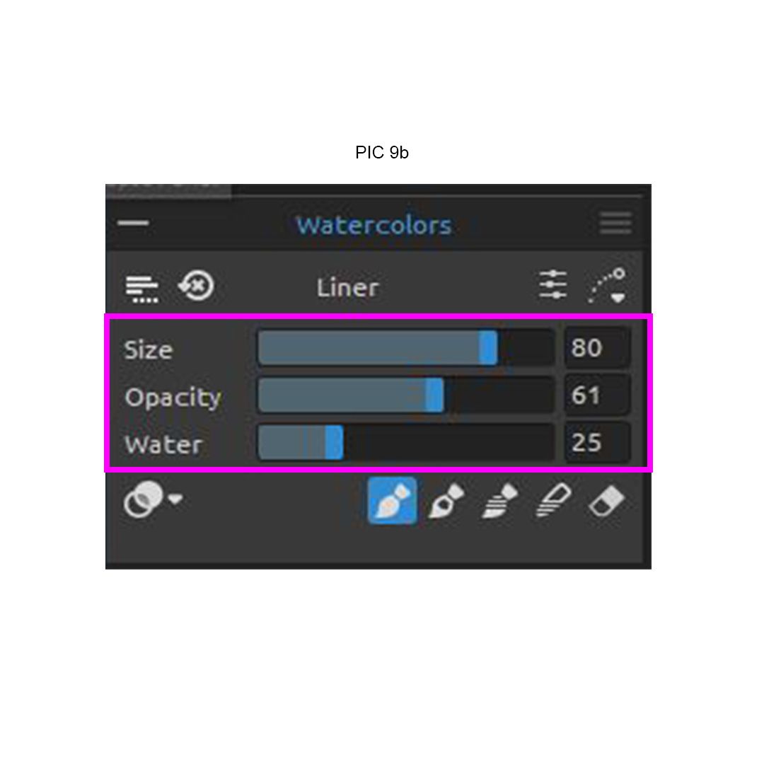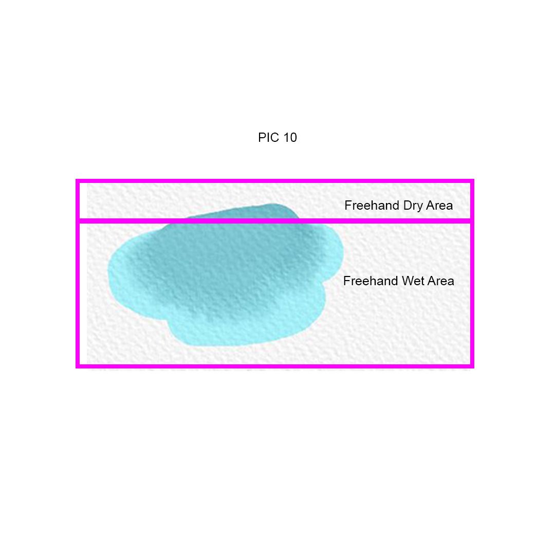 Also just like the traditional medium to achieve the wash affect certain layers and/or areas were wet with virtual water exactly as in the real world. This was achieved by either wetting an entire layer via the “Wet or Dry the Layer” option(ref pic 8a,8b-the blue area denotes an area/layer that has water applied to it). Or by painting freehand with a brush with water with no pigment (ref pic 9a.9b) and then painting inside and/or outside the affected area with a brush possessing color depending on the desired affect.(ref pic 10.)