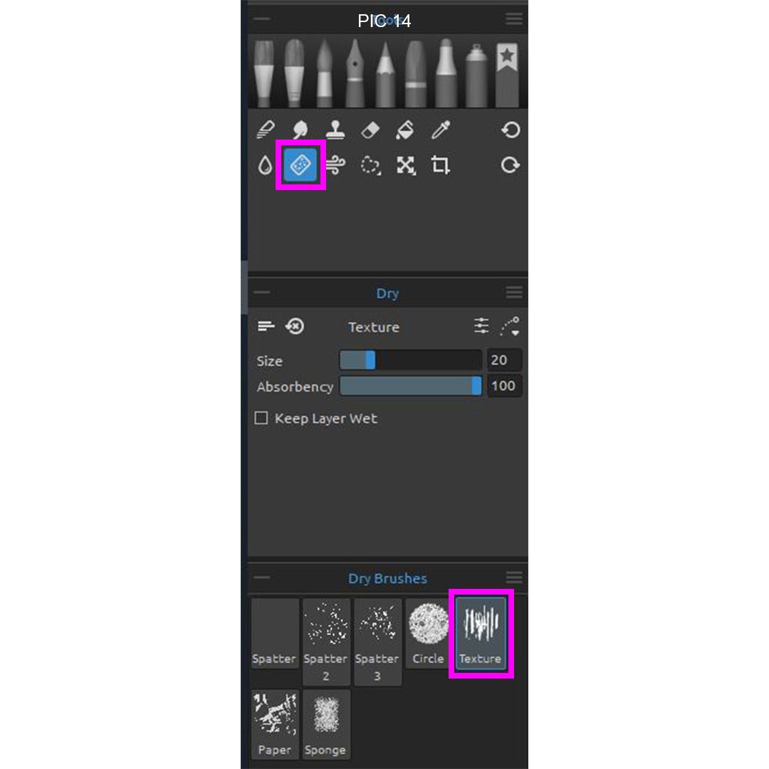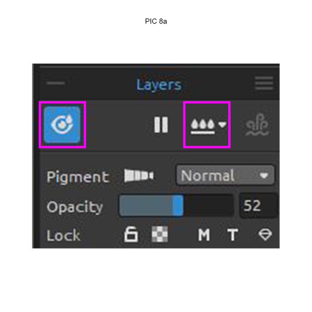 Além disso, assim como no meio tradicional, para obter o efeito de lavagem, certas camadas e/ou áreas foram molhadas com água virtual, exatamente como no mundo real. Isso foi obtido molhando uma camada inteira por meio da opção "Molhar ou Secar a Camada" (ver fotos 8a e 8b - a área azul indica uma área/camada que recebeu água). Ou pintando à mão livre com um pincel com água sem pigmento (ver fotos 9a e 9b) e, em seguida, pintando dentro e/ou fora da área afetada com um pincel com cor dependendo do efeito desejado (ver foto 10).