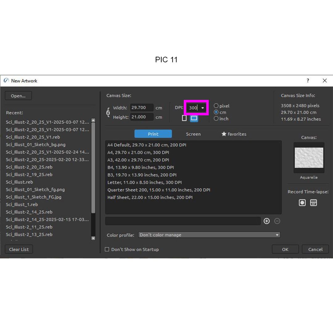 Para garantir que a camada de detalhes fosse bem definida, a imagem foi definida para um mínimo de 300 dpi. Isso foi estabelecido ao criar o documento - "Arquivo - Novo" - e ao alterar o valor na caixa de diálogo (ref. figura 11). Se o documento já tiver sido criado, ele pode ser alterado em "Janela - Propriedades - Tamanho da Tela". Como no processo tradicional, o tamanho do pincel foi diminuindo progressivamente, com menos água e mais pigmento, à medida que a ilustração tomava forma.