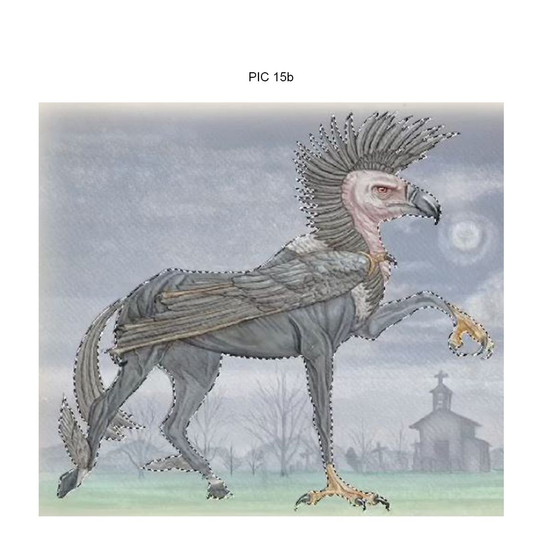 Para dar contraste e harmonia ao animal em relação ao restante da imagem, foram feitos ajustes. Para mostrar que o primeiro plano fazia parte da antiga textura do papel, o processo das figuras 15a, b, c e d foi aplicado à camada de textura do papel. No entanto, em vez de 100% preto, a seleção foi preenchida com um cinza escuro por meio da ferramenta de balde de tinta "G" no menu de amostras "Janela - Amostras - Escala de Cinza" para dar à camada um grau de opacidade. 100% preto é totalmente opaco em uma máscara de camada e 100% branco é totalmente transparente; portanto, qualquer tom de cinza está em algum lugar entre ambos os valores/opacidades.