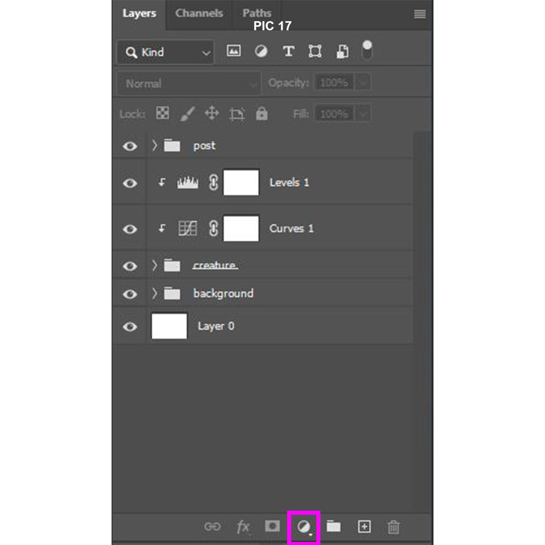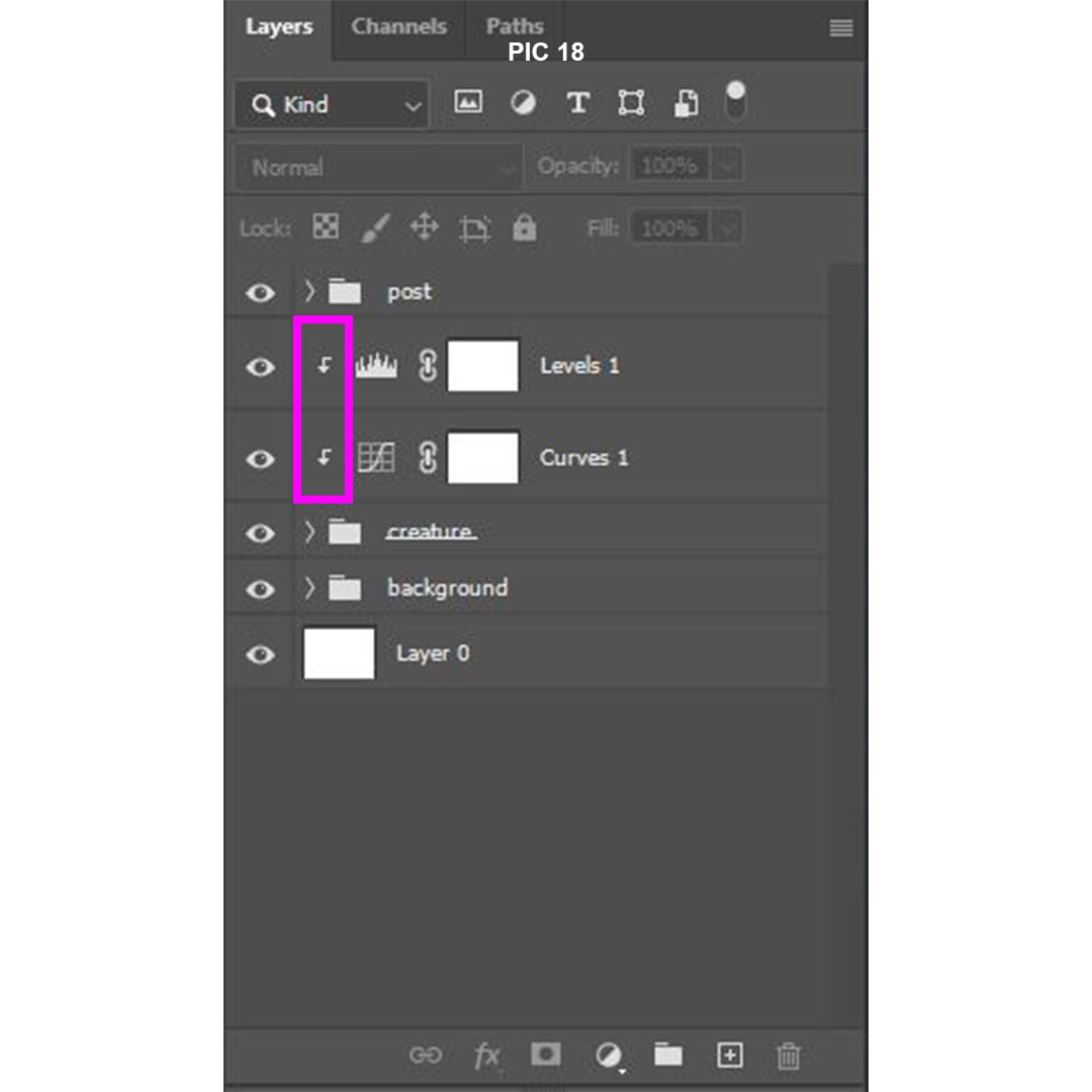 Emphasis to the foreground layer was given by selecting and and duplicating it“ Ctrl-J” with this copy situated above the original layer and set to a multiply mode at an opacity of about 25%. This alteration was reinforced with the the addition of a curves and levels adjustment(s) created by selecting the“Create new Fill or Adjustment Layer” icon(ref pic 17).These changes only affected the foreground layer by means of pressing “Alt” between the adjustment and target layer thus creating a link between both represented by an arrow icon.(ref pic 18)