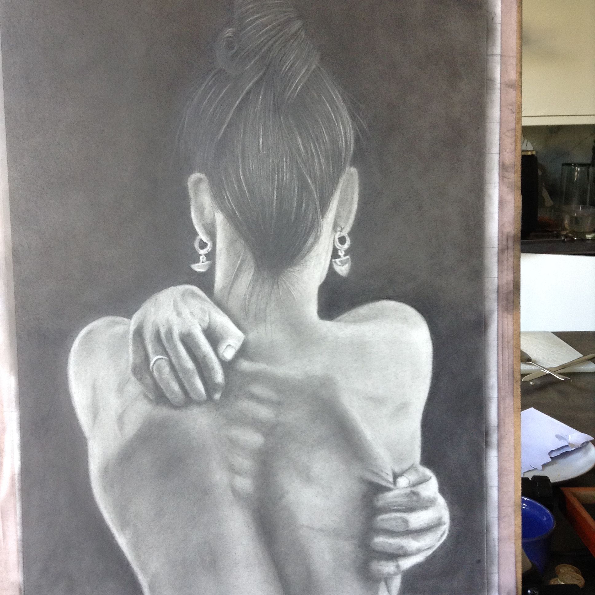 I think you can also experiment with the observation around the spine, the vertebra are such a wonderful opportunity to create an illusion of highlights and shadow. If you still have energy for it, try using your kneadable eraser to create a small highlight in the middle of your current highlight, as well as adding a very slight shadow in your existing shadow of the vertebra. If you do this, please make sure to do it with an experimental mindset, step back after you make the marks and see if you can see how the illusion works. Imagine the light shining onto the figure in the drawing.