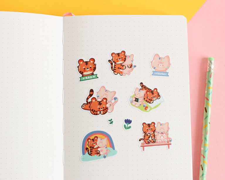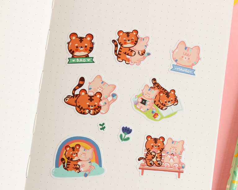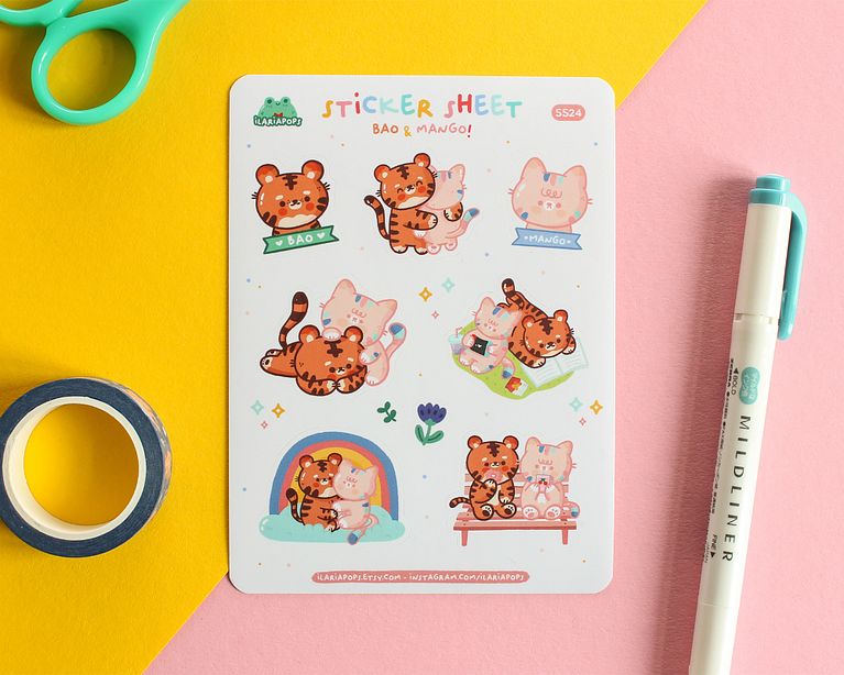 Say hello to my newest sticker sheet featuring two of my favorite characters: Bao the Tiger and Mango the Rainbow Cat! This duo is all about bold colors, playful energy, and a little bit of mischief.