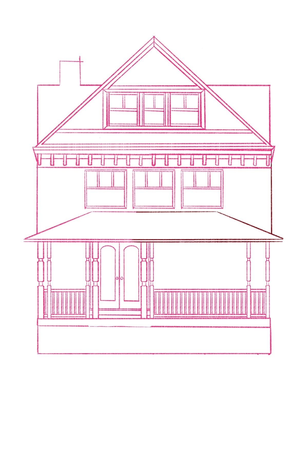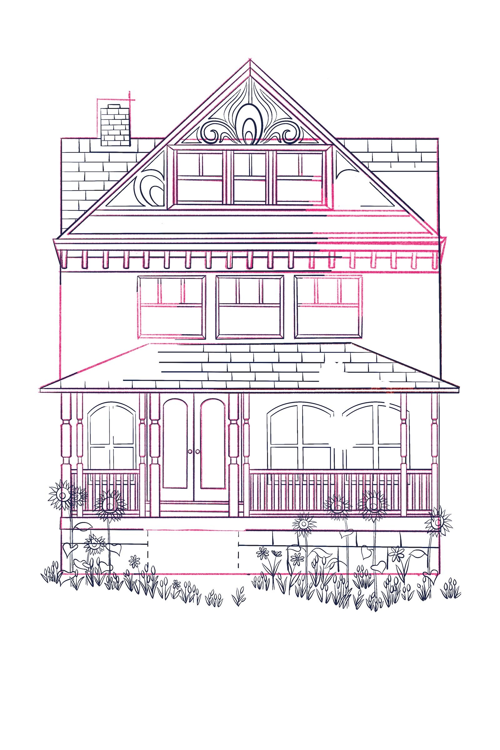 Comecei a esboçar uma casa imaginária que me lembrasse da bela arquitetura de Buffalo. Eu também queria desenhá-la no verão, já que Buffalo é conhecida por seus invernos rigorosos, mas também tem verões maravilhosos. Usei a ferramenta Guia de Desenho do Procreate e o lápis 6B para criar linhas retas e formas nítidas que eu pudesse traçar mais tarde. Sempre faço meus esboços em uma cor vibrante para poder vê-los facilmente na próxima etapa, quando aplico a tinta por cima.