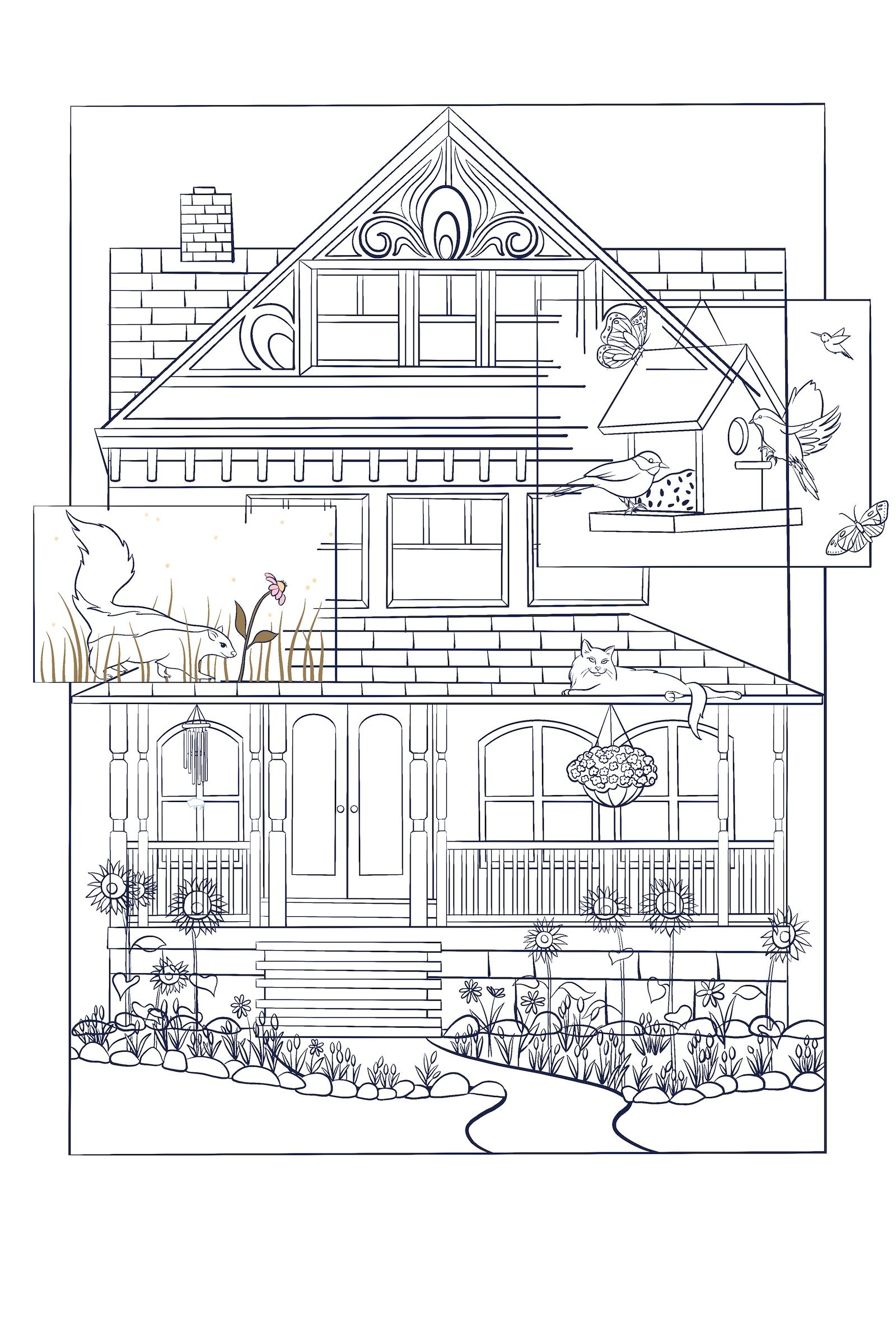 Em seguida, adicionei uma borda ao redor do desenho e inserções destacáveis para adicionar alguns detalhes que realmente deram a ele o clima de Buffalo. Buffalo é muito verde, então adicionei alguns elementos naturais como pássaros, gambás (tão fofos!), flores no jardim, vasos pendurados na varanda e um pequeno sino de vento do Buffalo Bills. Nesse ponto, desativo a camada de esboço e me concentro na arte-final.