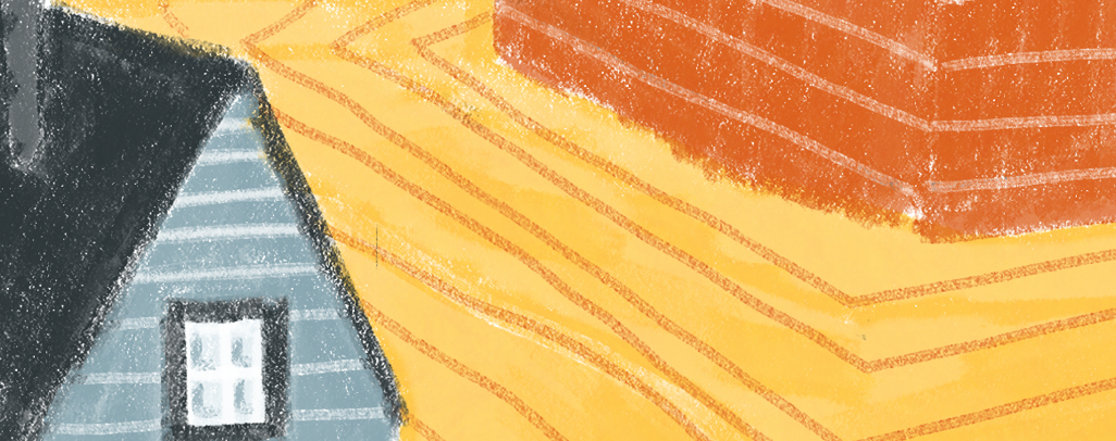 Detalhes e Acabamentos. Aqui, adiciono os detalhes que dão vida à cena: as janelas, as chaminés, um poste de luz, uma placa de rua e alguns pássaros estilizados no céu. Para as linhas mais finas, como as do chão ou das paredes das casas, uso a técnica de subtração descrita na minha dica.
