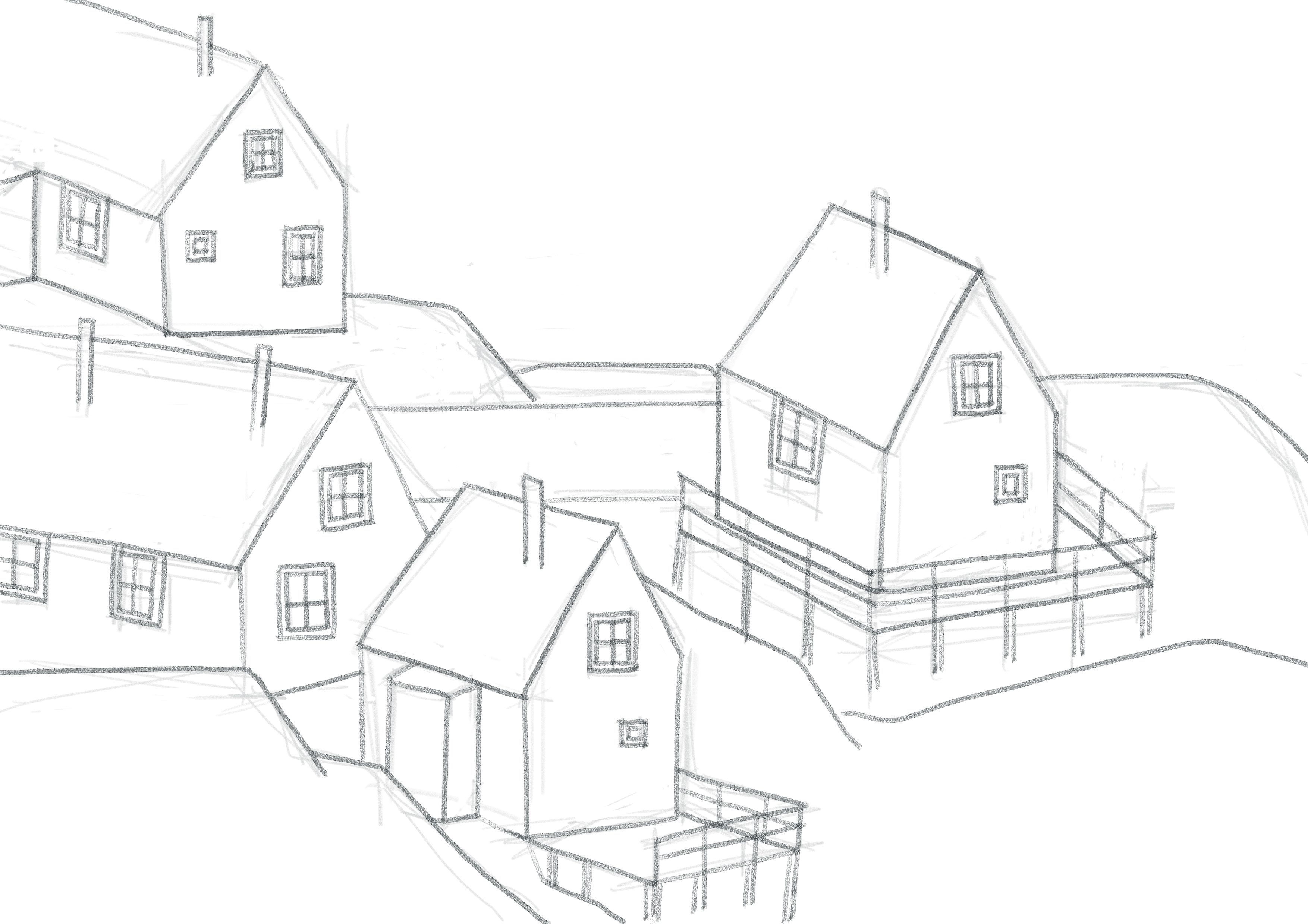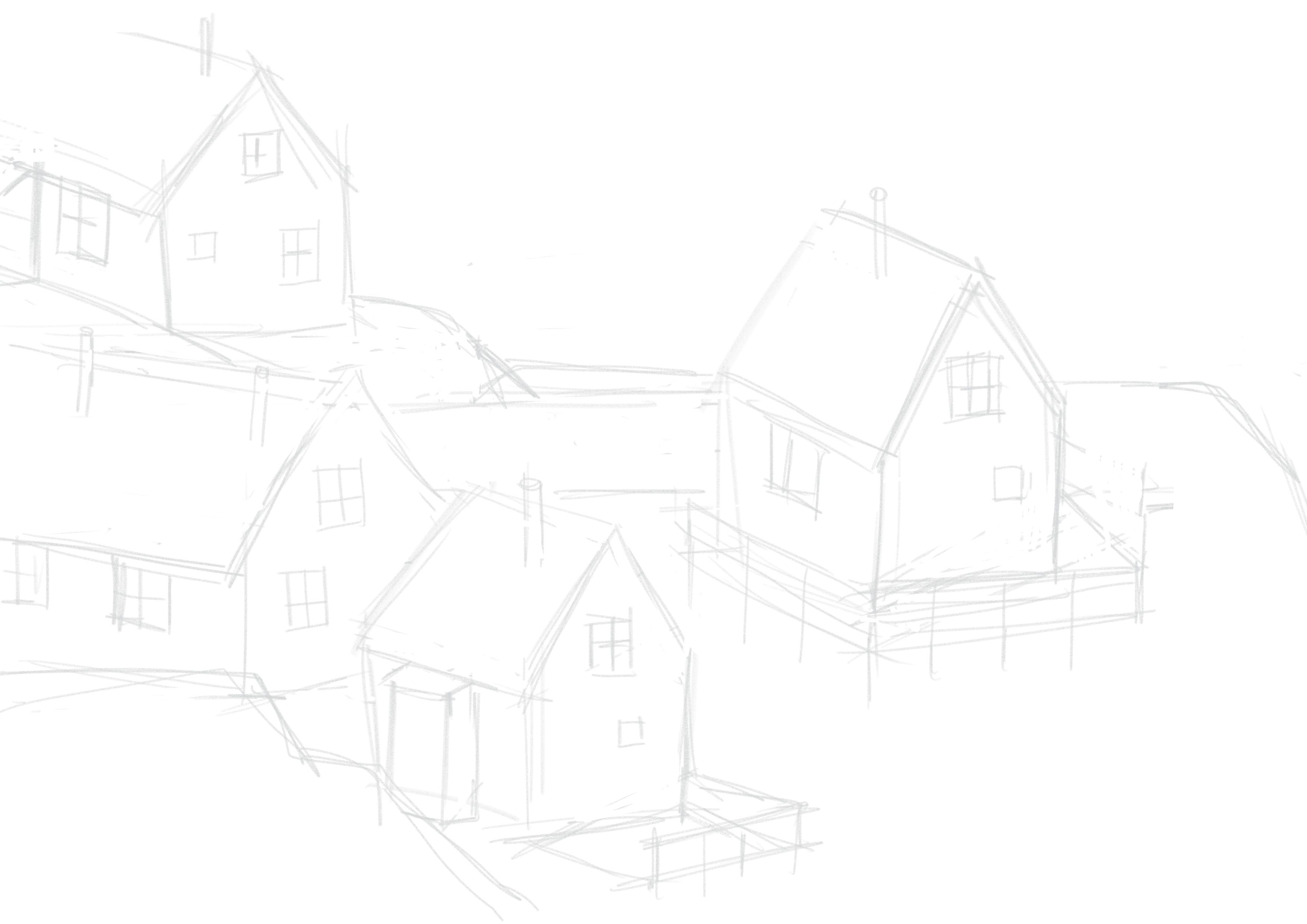 Tudo começa com um esboço rápido feito com o pincel "Lápis". Nesta fase, não me preocupo com a perfeição, mas me concentro na composição geral, na disposição das casas e na criação de um bom equilíbrio visual.