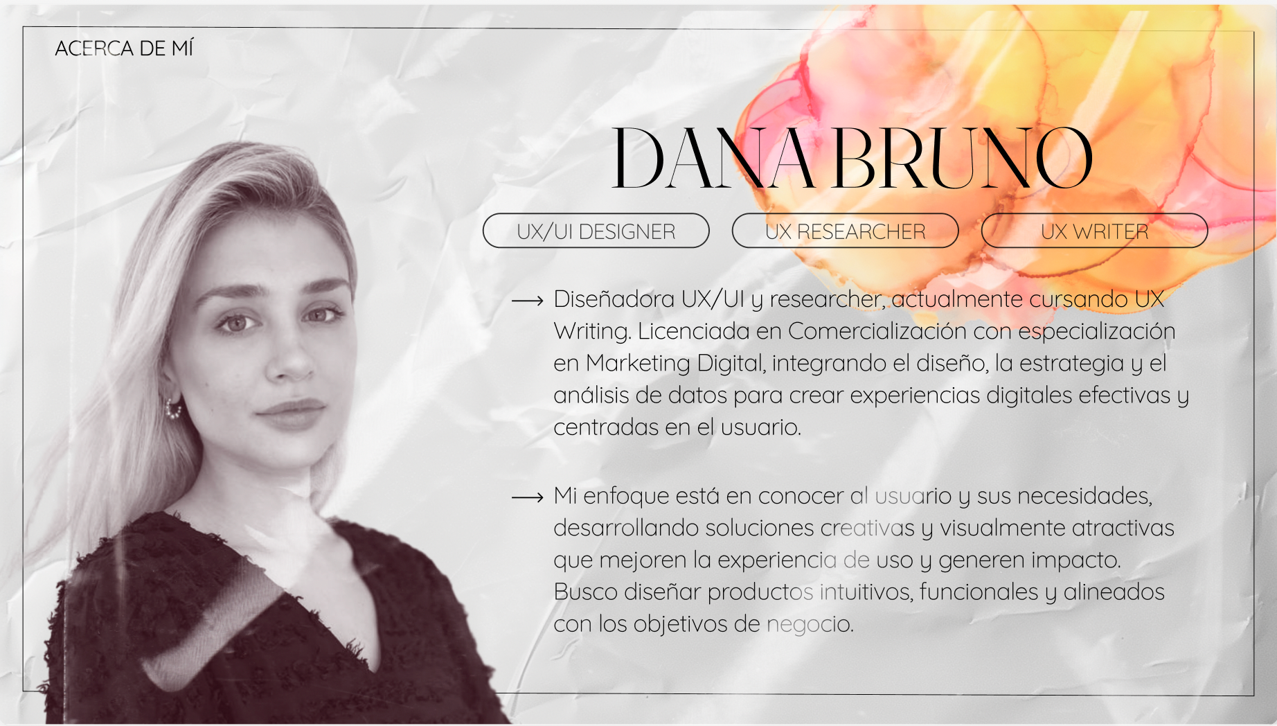 Hola, soy Dana Bruno, Licenciada en Comercialización con formación y experiencia en UX Design, UX Research, UX Writing y Diseño UX/UI Avanzado.