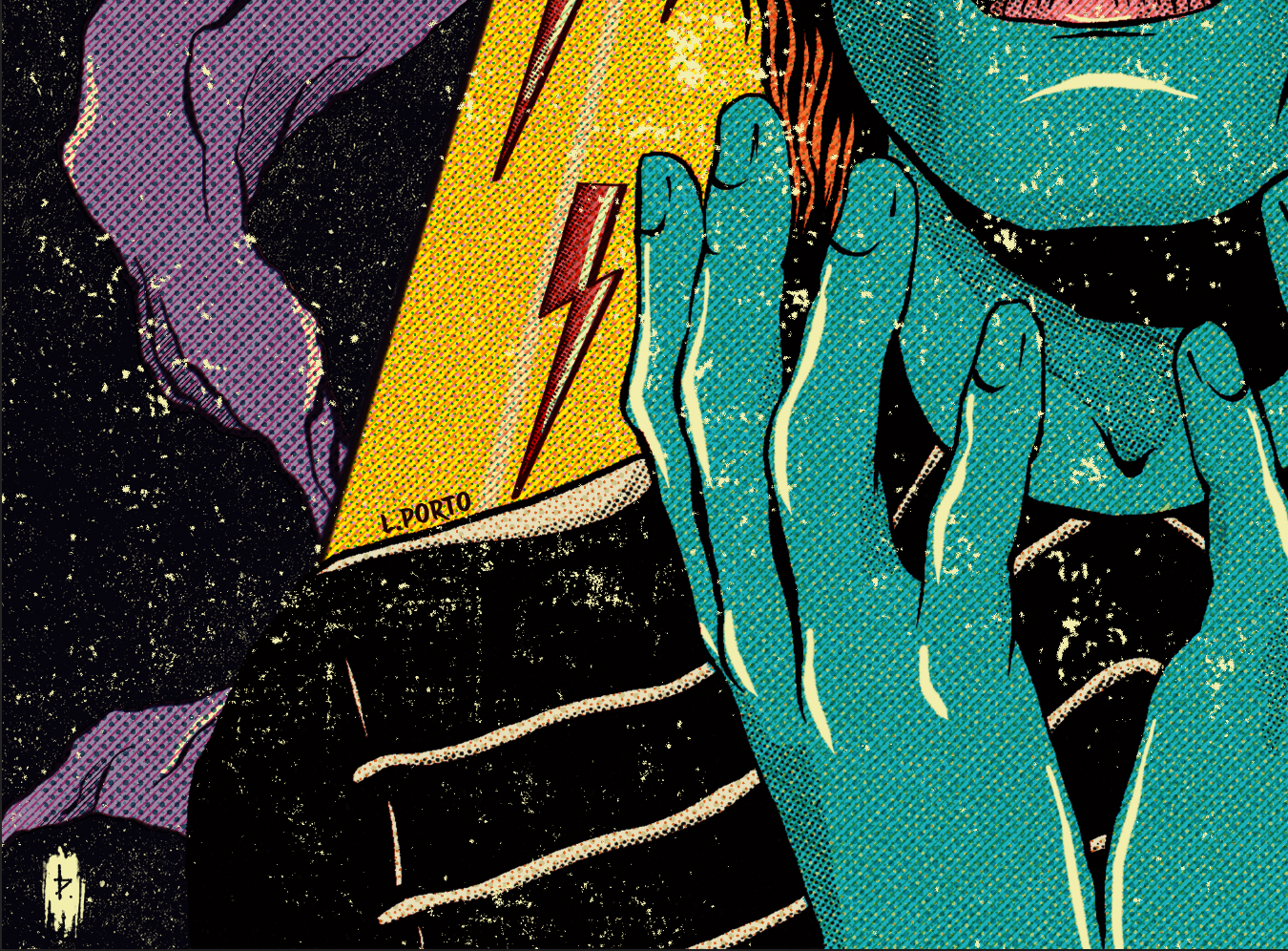 Para manter a estética de revista de quadrinhos antigos, utilizei pincéis especiais para "sujar" e adicionar ruídos à imagem final e assinar :)