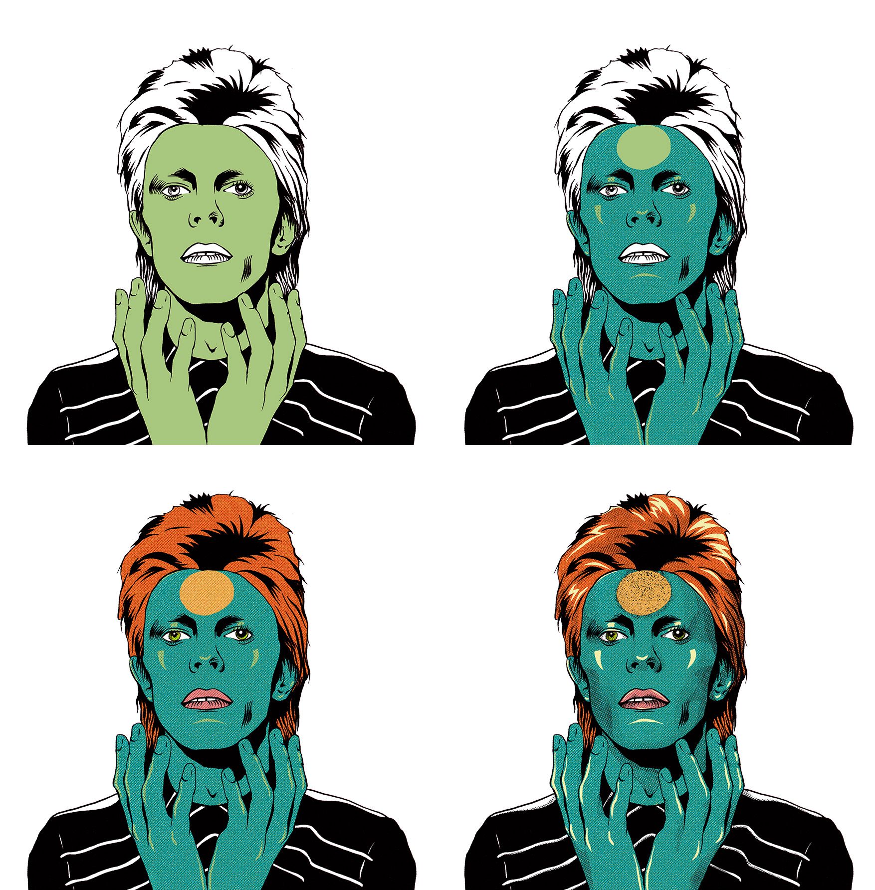 Após abrir o arquivo no Photoshop, chegou a hora de definir as cores principais do personagem. Para dar um ar de ser de outro planeta, optei por um verde para o tom principal do Bowie, depois adicionei texturas em tonalidades de azul e laranja para trazer mais profundidade. Quis utilizar a tonalidade original para os cabelos, para manter a personalidade dele mais proeminente. Adicionei também cores e textura aos olhos e boca. Cada cor final é uma soma de 3 ou mais cores aplicadas com pincéis halftone. Ao final, achei importante adicionar sombras e brilho para realçar determinados pontos da ilustração.