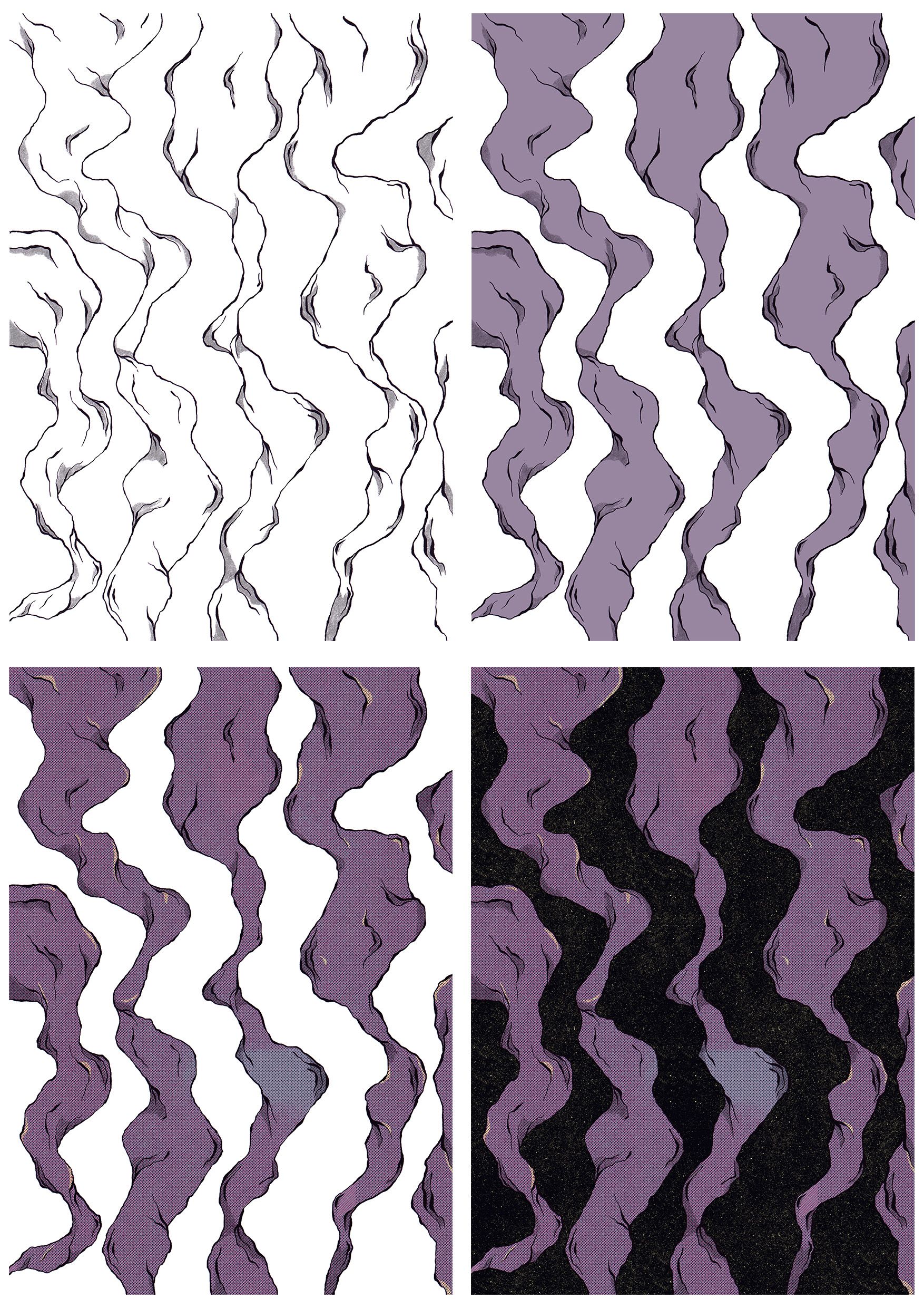 Com o personagem de primeiro plano pronto, chegou a hora de criar o fundo. Comecei fazendo os traços da fumaça no Procreate, importando para o Photoshop e seguindo a mesma lógica da colorização do personagem. Adicionei uma cor base e, em seguida, trabalhei as tonalidades mais profundamente com pincéis especiais. Ao final, adicionei um fundo preto com respingos claros, para simular o espaço.