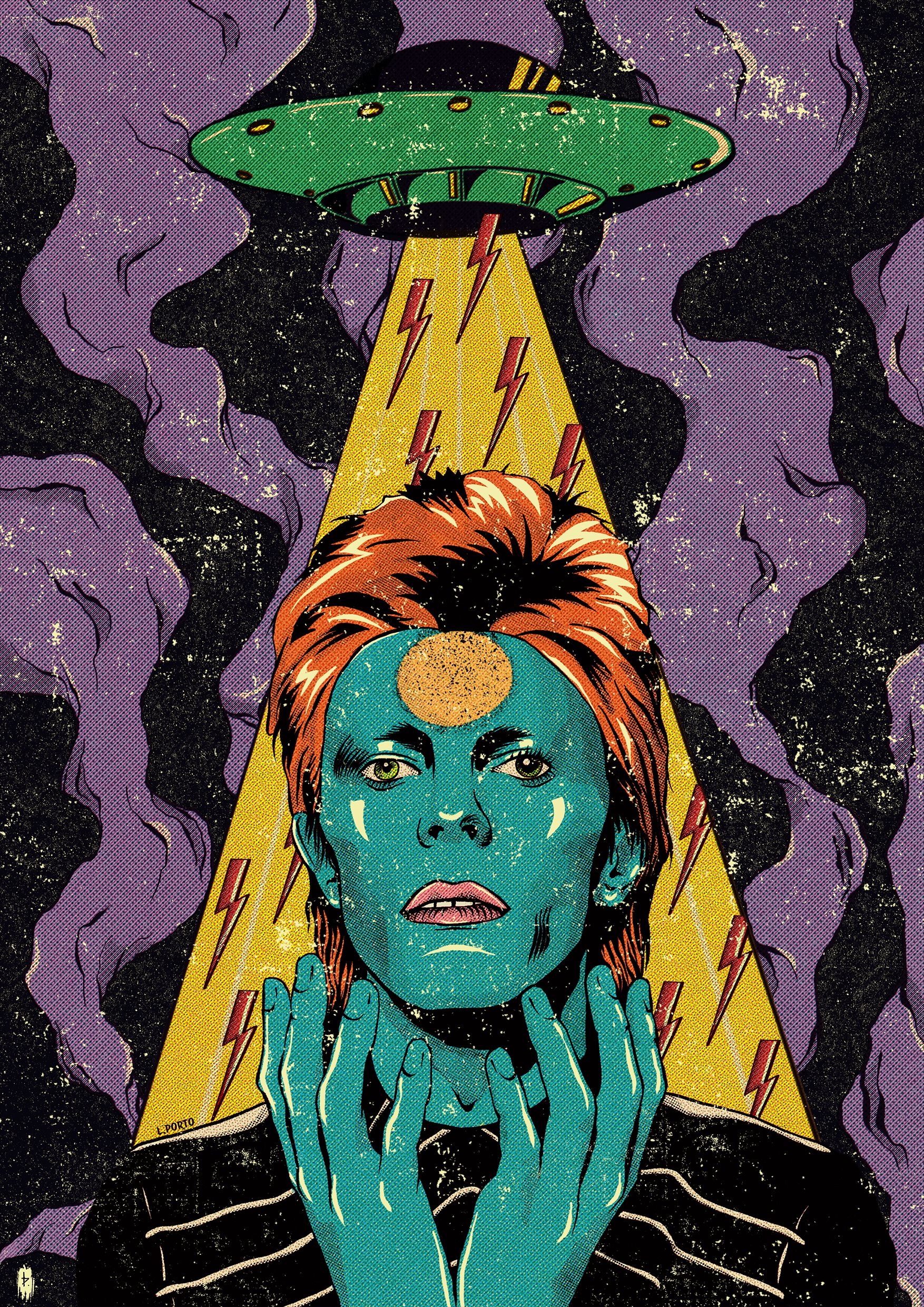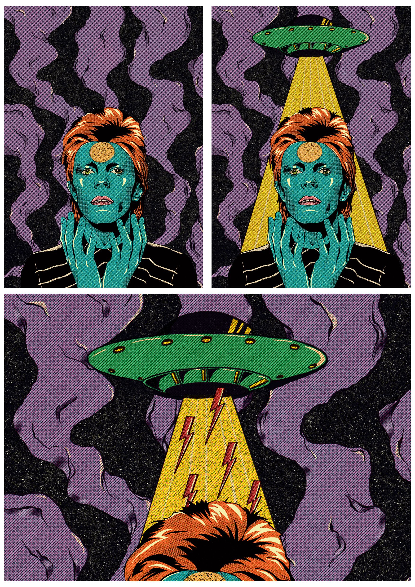A ideia inicial era inserir a imagem de Bowie no espaço, com elementos como planetas, nebulosas, etc. Porém fez mais sentido ao longo do processo utilizar um disco voador como se estivesse sendo invocado por Bowie. Os elementos foram testados conforme a ilustração foi sendo desenvolvida, e acabei optando por raios (símbolo icônico de Bowie) saindo na espaçonave. Para ilustrar ainda mais a ideia de Bowie como um ser de outro planeta, a escolha da paleta de cores foi essencial.